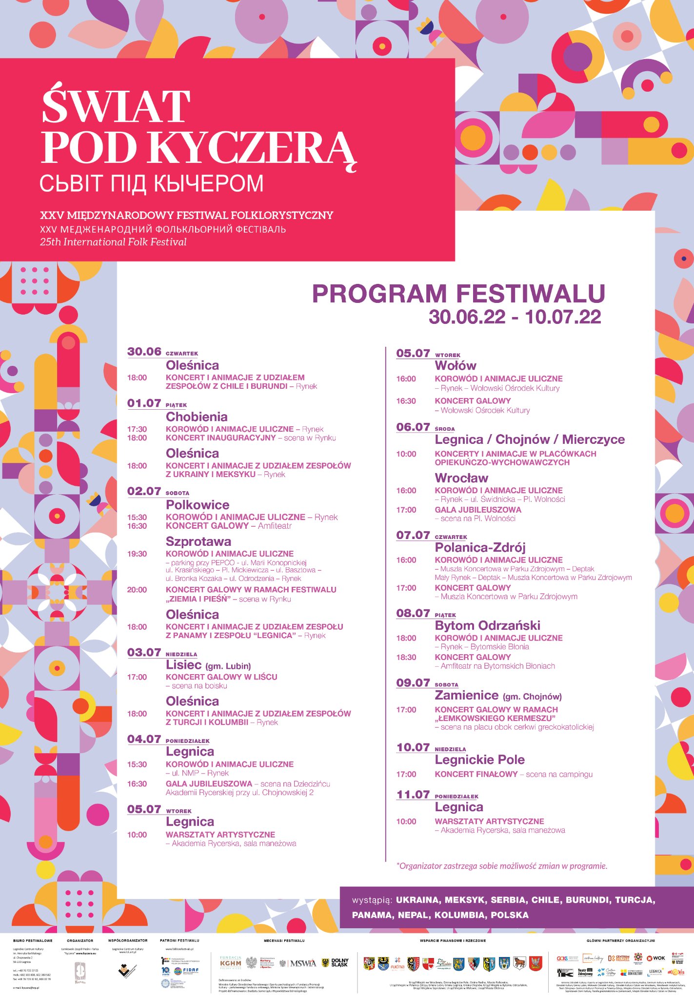 6 lipca o godzinie 16.00 w ramach XXV edycji Międzynarodowego Festiwalu Folklorystycznego „Świat pod Kyczerą”, rynkiem Wrocławia przejdzie barwny korowód. Wezmą z nim udział zespoły z Ukrainy, Meksyku, Serbii, Chile, Burundi, Turcji, Panamy, Nepalu, Kolumbii i Polski. O godzinie 17.00 na Placu Wolności odbędzie się koncert galowy z udziałem wszystkich gości. Organizator festiwalu, ŁZPiT „Kyczera”, serdecznie zaprasza do udziału w wydarzeniu!