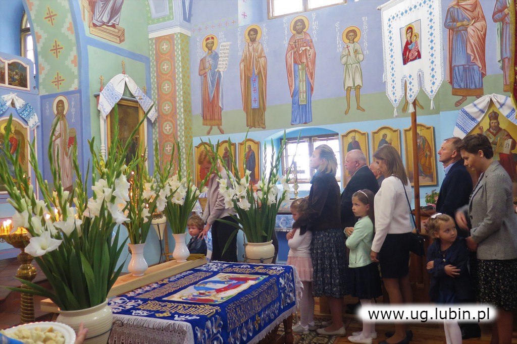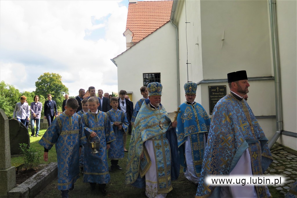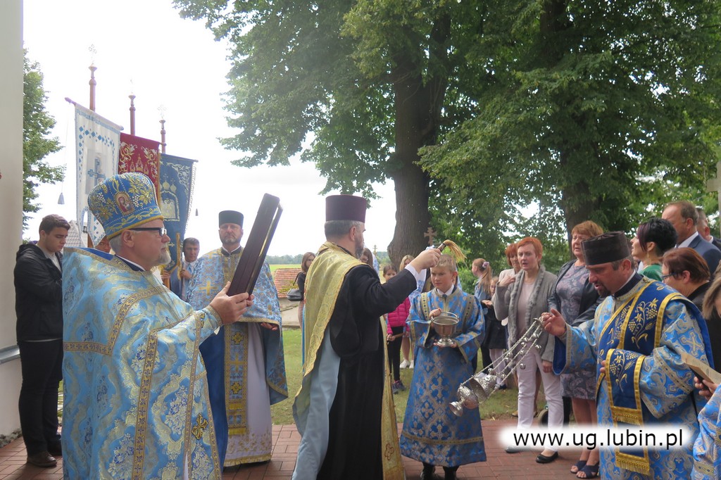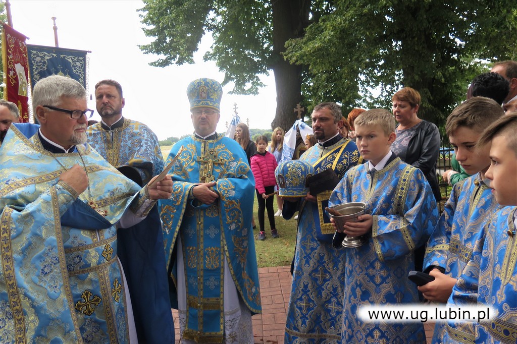 Po świątecznej procesji wokół świątyni proboszcz poświęcił bukiety zbóż, ziół i kwiatów przyniesione przez wiernych. Podziękował przybyłym duchownym i chórowi parafialnemu, który pięknym śpiewem uświetnił całą uroczystość. Zwrócił się z ciepłym słowem podziękowania do wiernych, którzy licznie przybyli z okolicznych parafii i z miasta Krynica. W uroczystościach święta wziął udział Pan Tadeusz Kielan Wójt Gminy Lubin. Dziękując proboszczowi powiedział “Przyznam, że nie wyobrażam sobie Gminy Lubin bez tak licznej grupy wiernych wyznania prawosławnego. Różnorodność, wzajemny stosunek, dbałość o troska o siebie jest naszym wielkim atutem. Bardzo się cieszę, że mogę współuczestniczyć w najważniejszych uroczystościach cerkiewnych”.