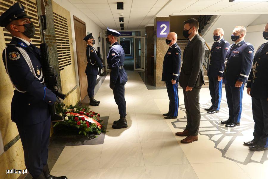Główne uroczystości rozpoczęły się złożeniem kwiatów przed Tablicą Pamięci w gmachu Komendy Głównej Policji, gdzie umieszczone są inskrypcje epitafijne z nazwiskami policjantów, którzy oddali życie w związku ze służbą, ratując innych bądź stając w ich obronie. Następnie uroczystość przeniosła się przed Obelisk „Poległym Policjantom – Rzeczpospolita Polska” na dziedzińcu komendy.