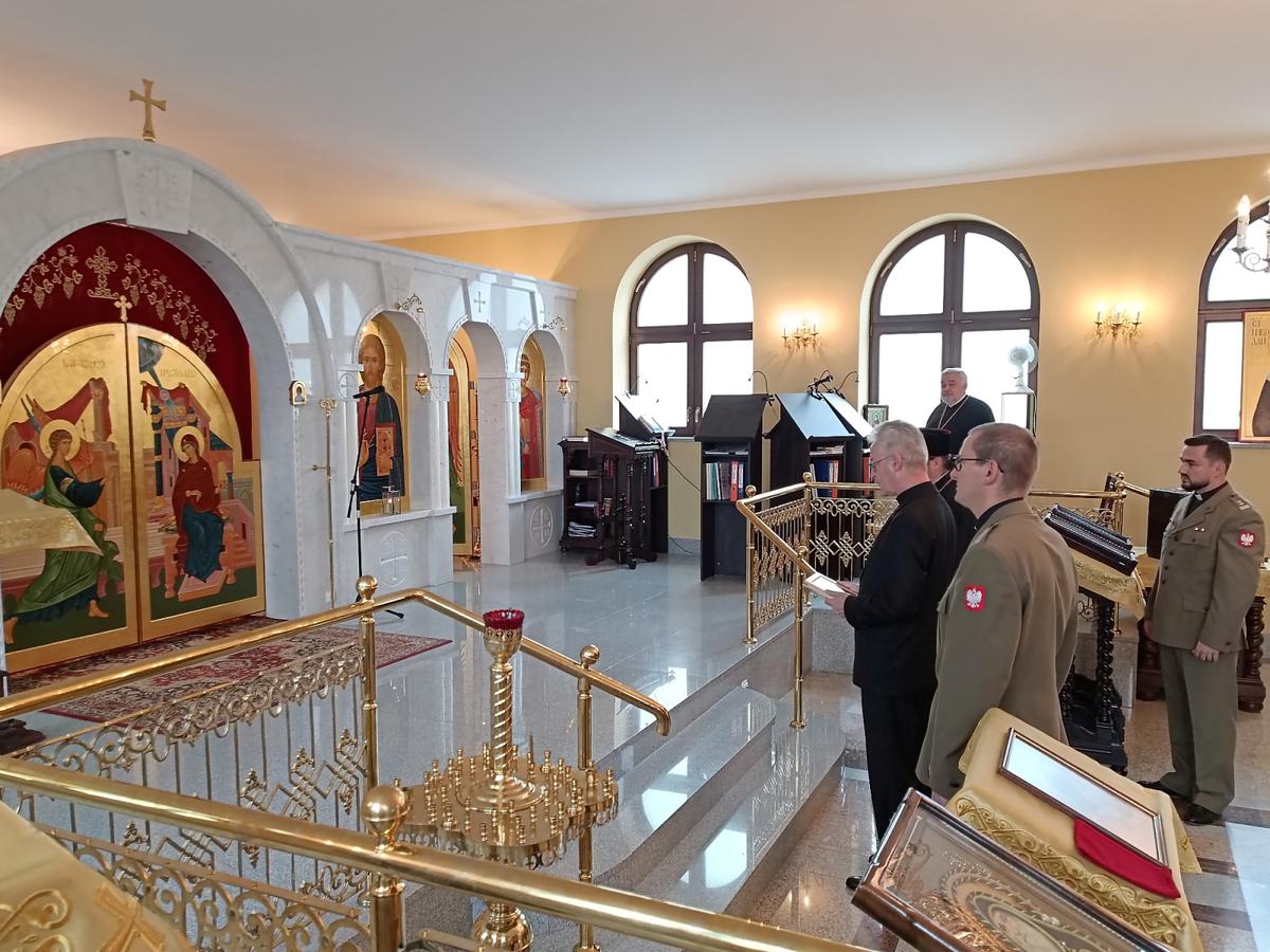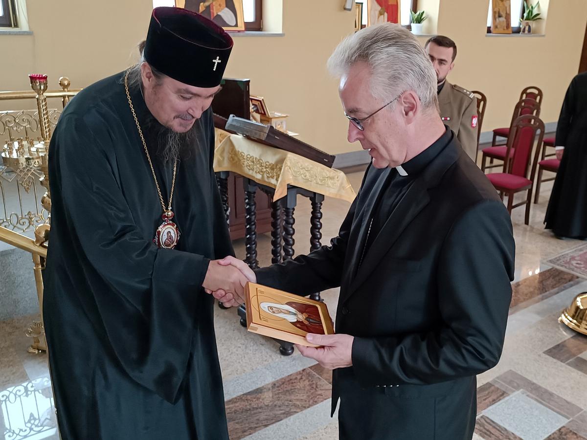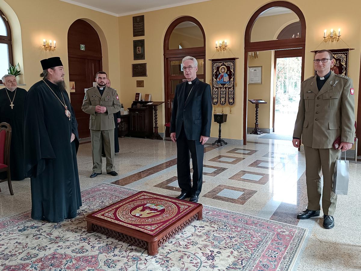 Arcybiskup Jerzy, Prawosławny Ordynariusz Wojskowy przywitał gości w prawosławnej katedralnej cerkwi wojskowej. Przybliżył historię i specyfikę prawosławnej świątyni, a także wręczył ordynariuszowi polowemu ikonę Matki Bożej – Miłującej (cs. Umilenije)