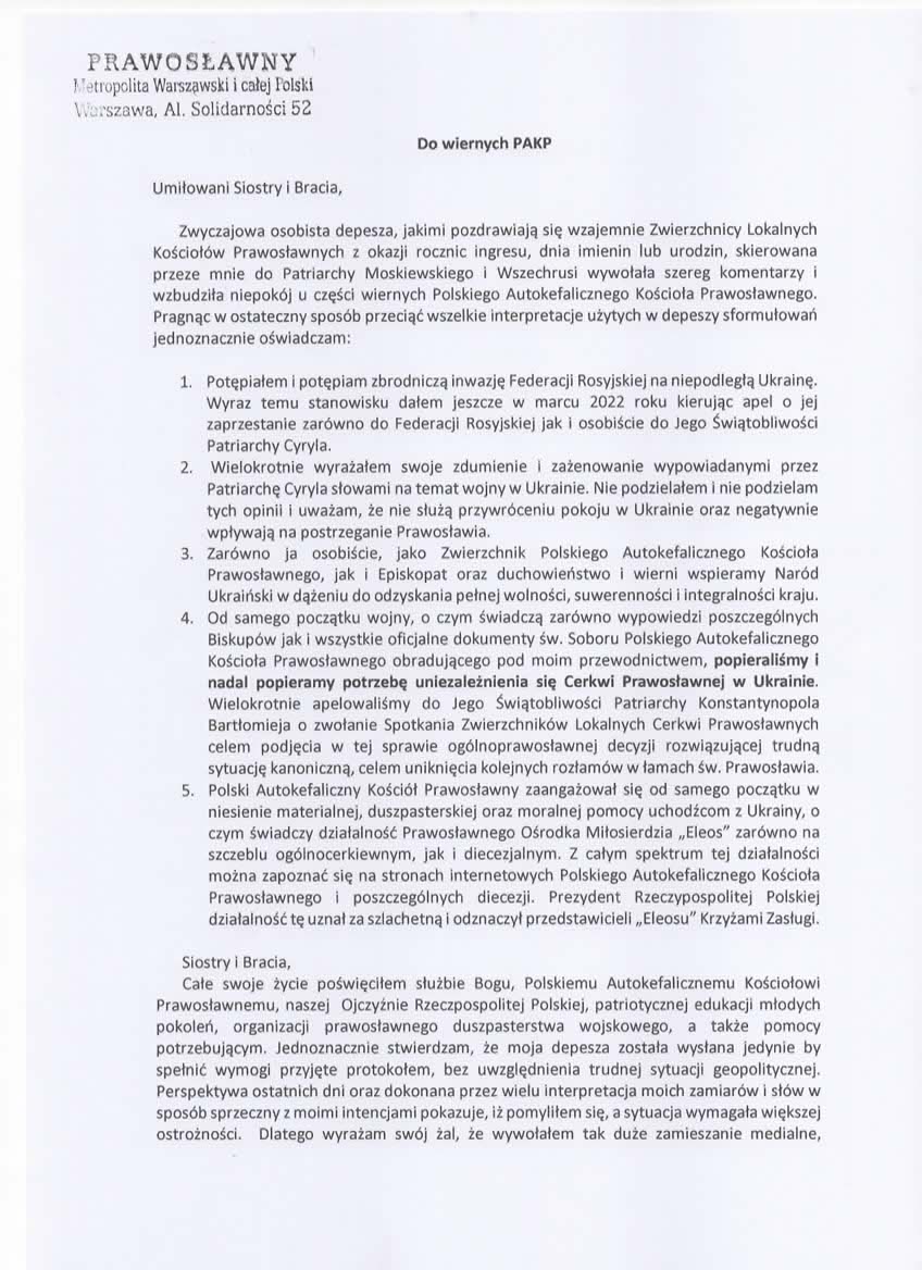 Zarówno ja osobiście, jako Zwierzchnik Polskiego Autokefalicznego Kościoła Prawosławnego, jak i Episkopat oraz duchowieństwo i wierni wspieramy Naród Ukraiński w dążeniu do odzyskania pełnej wolności, suwerenności i integralności kraju.