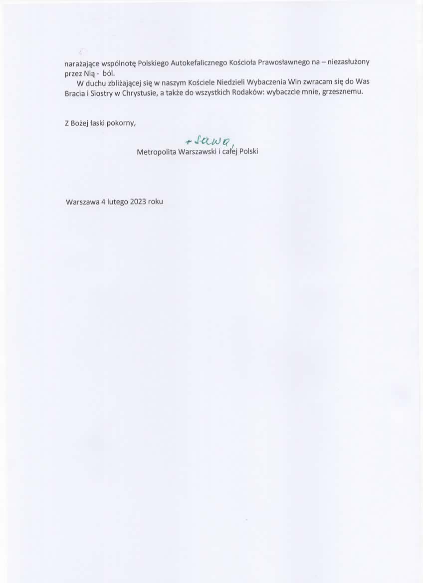 Całe swoje życie poświęciłem służbie Bogu, Polskiemu Autokefalicznemu Kościołowi Prawosławnemu, naszej Ojczyźnie Rzeczpospolitej Polskiej, patriotycznej edukacji młodych pokoleń, organizacji prawosławnego duszpasterstwa wojskowego, a także pomocy potrzebującym. Jednoznacznie stwierdzam, że moja depesza została wysłana jedynie by spełnić wymogi przyjęte protokołem, bez uwzględnienia trudnej sytuacji geopolitycznej. Perspektywa ostatnich dni oraz dokonana przez wielu interpretacja moich zamiarów i słów w sposób sprzeczny z moimi intencjami pokazuje, iż pomyliłem się, a sytuacja wymagała większej ostrożności. Dlatego wyrażam swój żal, że wywołałem tak duże zamieszanie medialne, narażające wspólnotę Polskiego Autokefalicznego Kościoła Prawosławnego na – niezasłużony przez Nią – ból.