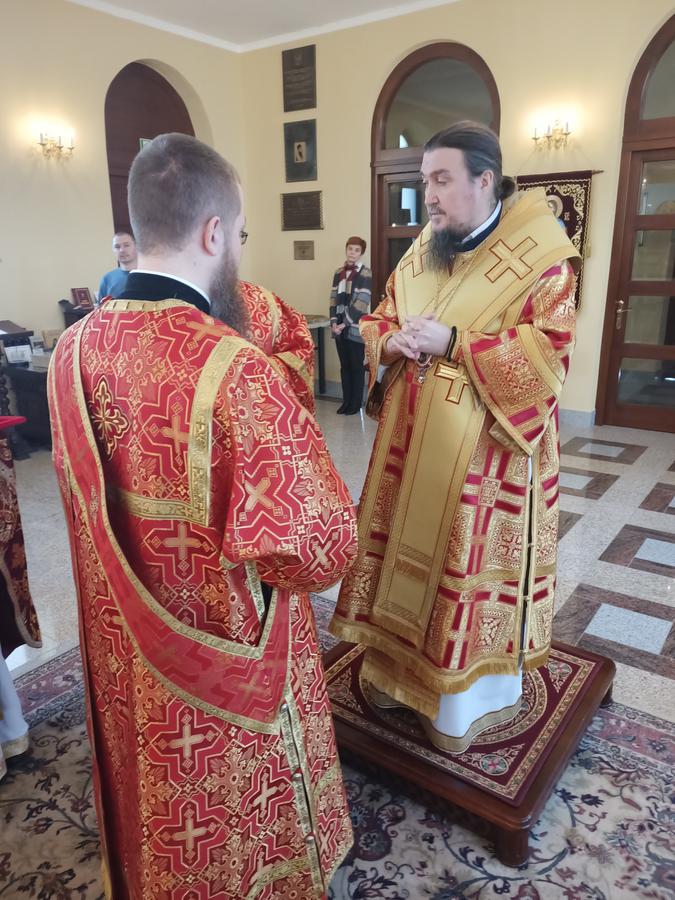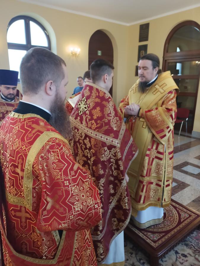 Podczas małego wejścia ordynariusz z okazji nadchodzącego święta Paschy podniósł do godności protojereja ks. mjr. Tomasza Paszko, a ks. diakona Michała Moczarskiego podniósł do godności protodiakona z prawem noszenia kamiławki.
