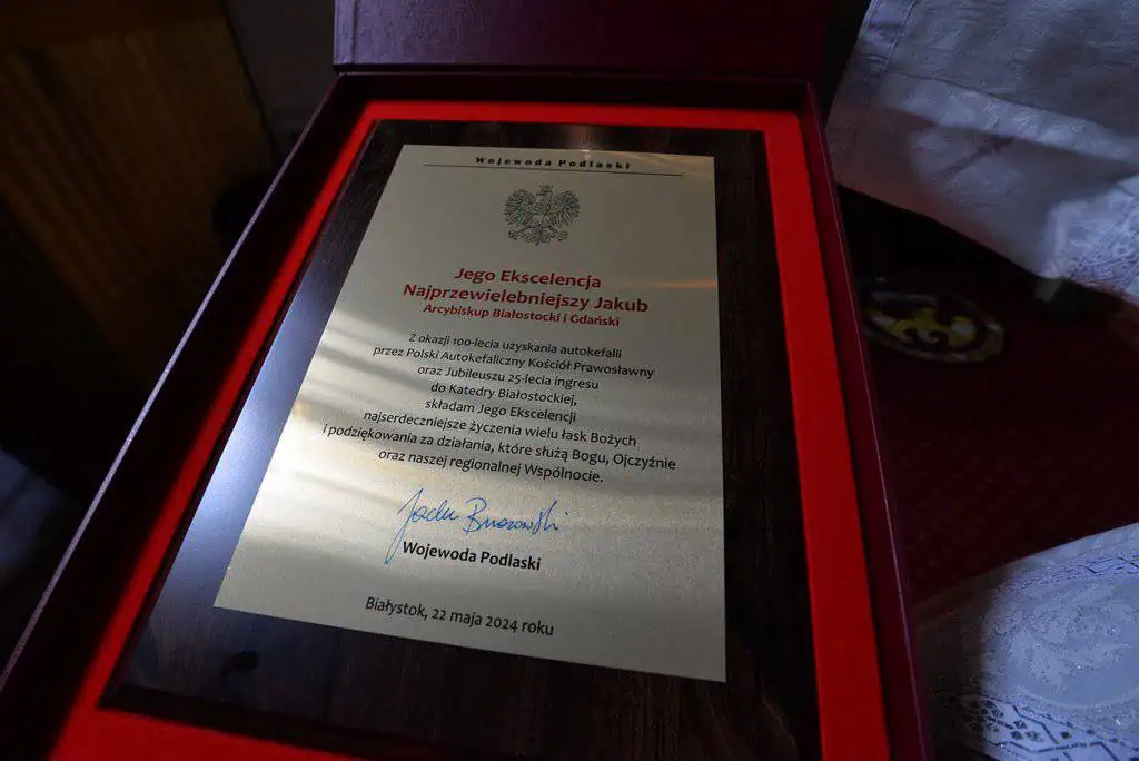 Na zakończenie swojej wypowiedzi Metropolita Sawa zwrócił się do gospodarza uroczystości Arcybiskupa Jakuba, dziękując mu za jego trud jako biskupa białostockiego. W uznaniu za jego działalności oraz jubileusz 25-lecia od momentu objęcia tronu biskupów białostockich Metropolita Sawa nagrodził Arcybiskupa Jakub orderem św. Równej Apostołom Marii Magdaleny I stopnia.