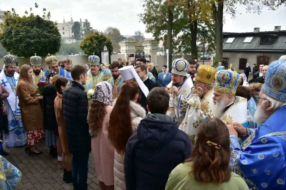Przed wejściem do cerkwi katedralnej hierarchów witały dzieci z bukietem róż, a następnie młodzież studencka. W wejściu do świątyni chlebem i solą arcypasterzy powitał Andrzej Bojko starosta cerkiewny w asyście Haliny Filipiuk przedstawicielki rady parafialnej. W świątyni proboszcz parafii katedralnej, ks. mitrat Andrzej Łoś, witając metropolitę Sawę i biskupów PAKP zaprosił do sprawowania świątecznej św. Liturgii w tym doniosłym niedzielnym dniu rocznic jubileuszowych.