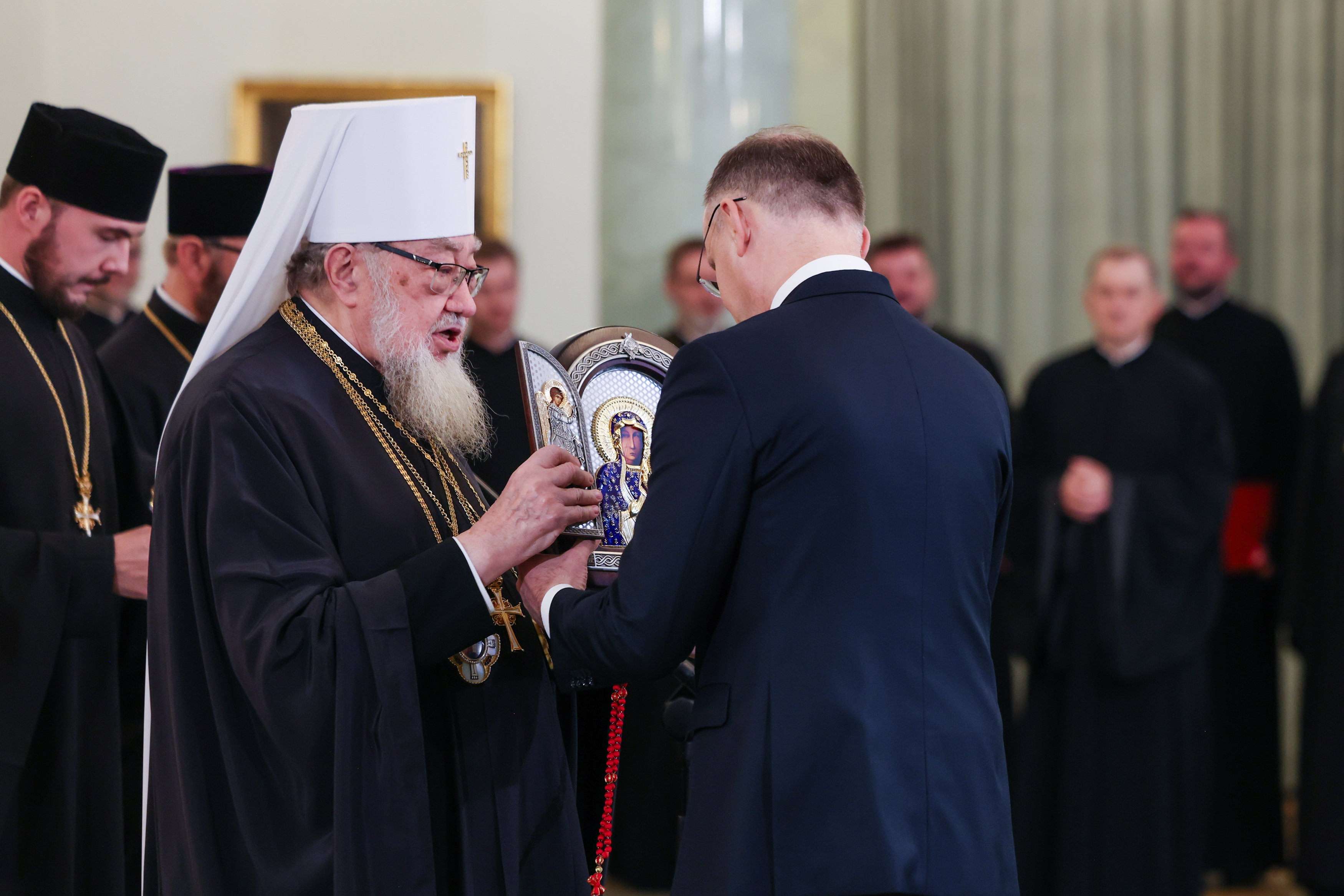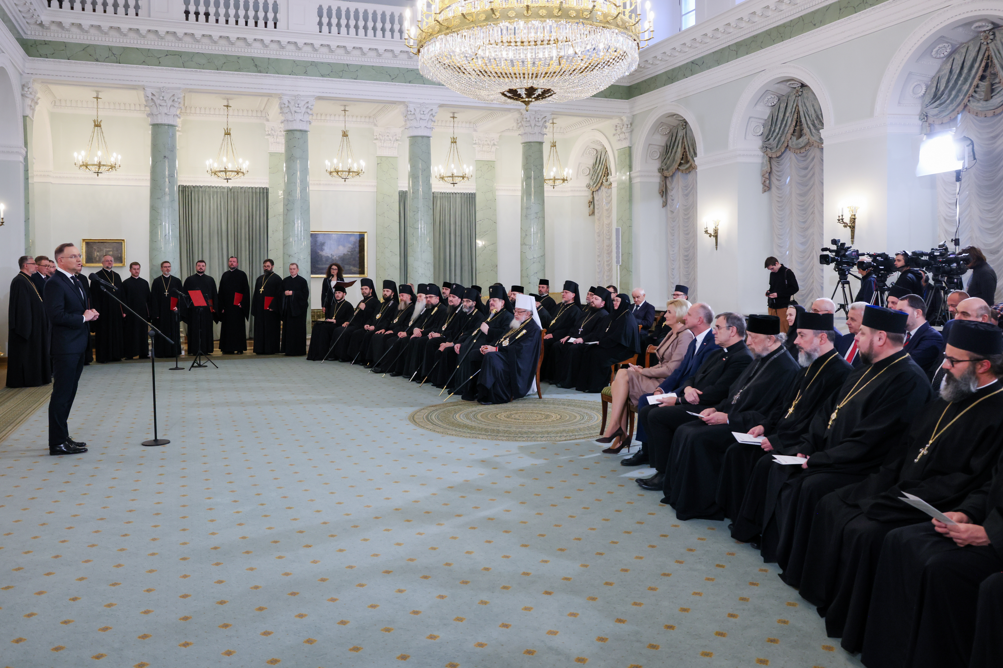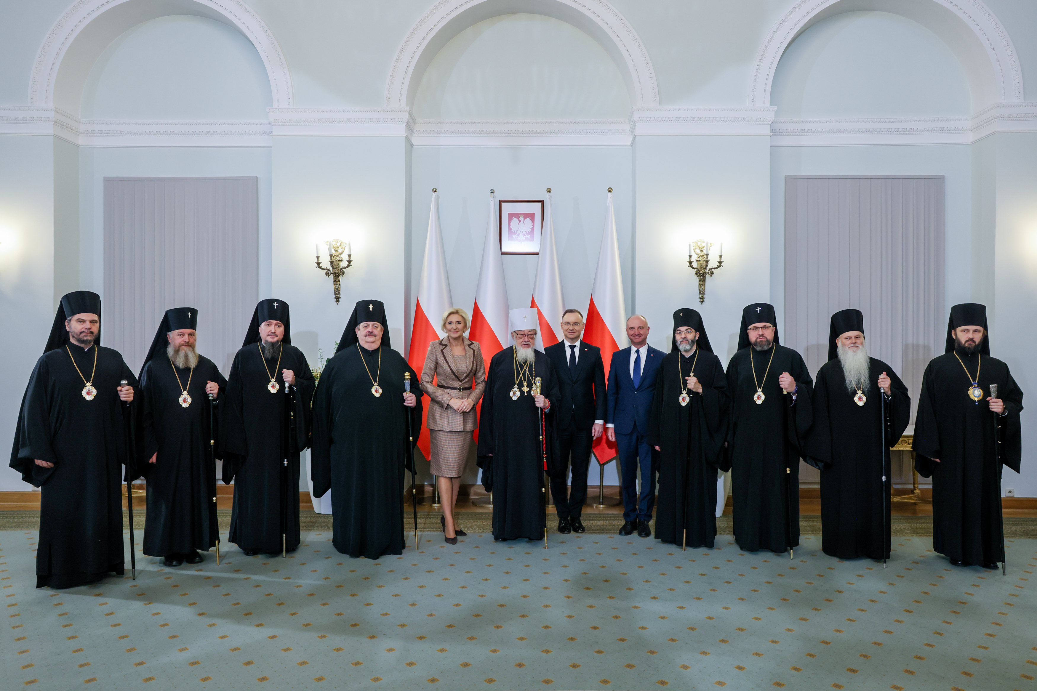 „Kościół prawosławny przeżywa historyczny moment…”, powiedział podczas spotkania zwierzchnik Polskiego Autokefalicznego Kościoła Prawosławnego. Jego Eminencja metropolita Sawa (Hrycuniak) odniósł się do uroczystego nabożeństwa w katedrze pw. św. Marii Magdaleny w Warszawie oraz koncertu muzyki cerkiewnej i patriotycznej na Sali Wielkiej Zamku Królewskiego w Warszawie, które odbyły się w przededniu spotkania. „Monarchowie byli obecni na Zamku w postaci swoich dusz” - powiedział. „Razem łączyli się w śpiewie cerkiewnym oraz w języku słowiańskim, który to święci Cyryl i Metody przynieśli do naszych przodków Wiślan i Polan Świętą Ewangelię, naukę Jezusa Chrystusa(…) prawosławni zachowali tę kulturę św. Cyryla i Metodego po dzień dzisiejszy” – kontynuował metropolita. „Jest to wielkie bogactwo, które budowało naszą Ojczyznę - w sensie duchowym, a także intelektualnym – zaznaczył Eminencja. Na zakończenie wyraził wdzięczność Prezydentowi za objęcie Honorowym Patronatem obchodów rocznicy 100-lecia autokefalii oraz za obecność – jak podkreślił – Ojca Narodu w ważnych miejscach dla Polskiego Prawosławia.