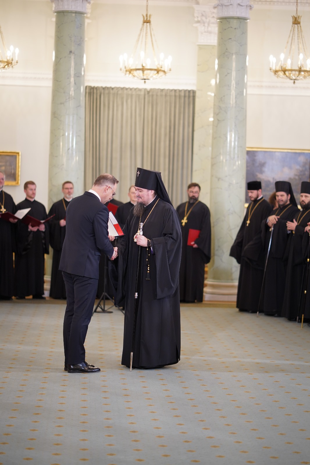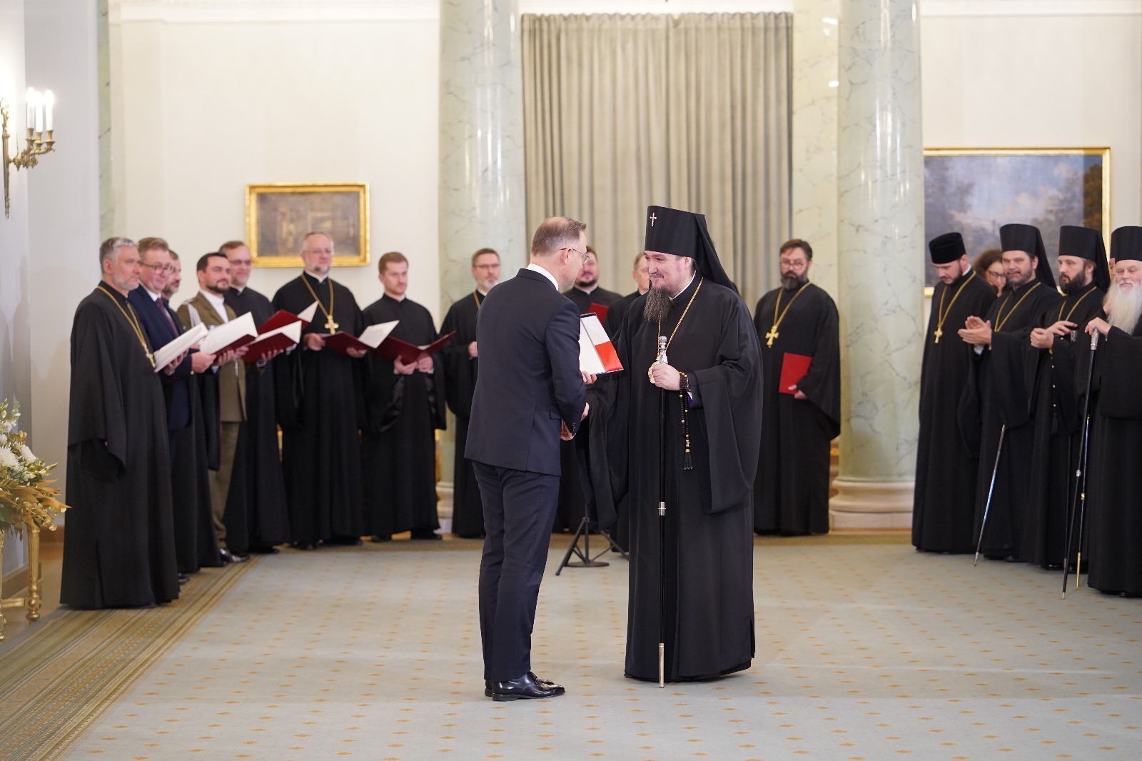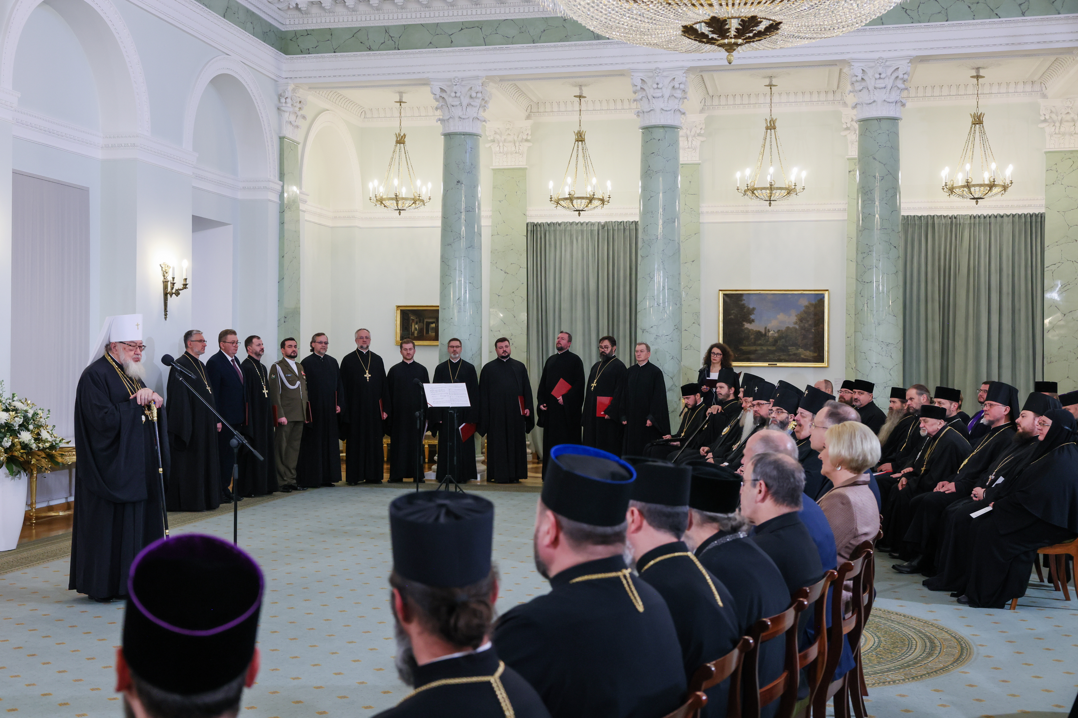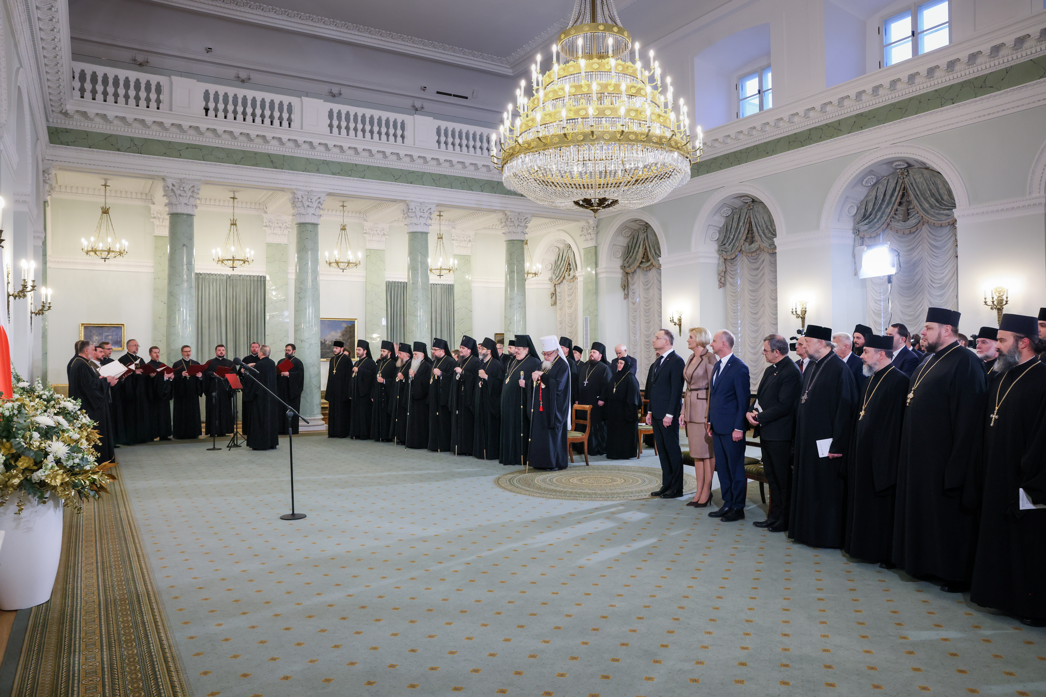 „Kościół prawosławny przeżywa historyczny moment…”, powiedział podczas spotkania zwierzchnik Polskiego Autokefalicznego Kościoła Prawosławnego. Jego Eminencja metropolita Sawa (Hrycuniak) odniósł się do uroczystego nabożeństwa w katedrze pw. św. Marii Magdaleny w Warszawie oraz koncertu muzyki cerkiewnej i patriotycznej na Sali Wielkiej Zamku Królewskiego w Warszawie, które odbyły się w przededniu spotkania. „Monarchowie byli obecni na Zamku w postaci swoich dusz” - powiedział. „Razem łączyli się w śpiewie cerkiewnym oraz w języku słowiańskim, który to święci Cyryl i Metody przynieśli do naszych przodków Wiślan i Polan Świętą Ewangelię, naukę Jezusa Chrystusa(…) prawosławni zachowali tę kulturę św. Cyryla i Metodego po dzień dzisiejszy” – kontynuował metropolita. „Jest to wielkie bogactwo, które budowało naszą Ojczyznę - w sensie duchowym, a także intelektualnym – zaznaczył Eminencja. Na zakończenie wyraził wdzięczność Prezydentowi za objęcie Honorowym Patronatem obchodów rocznicy 100-lecia autokefalii oraz za obecność – jak podkreślił – Ojca Narodu w ważnych miejscach dla Polskiego Prawosławia.