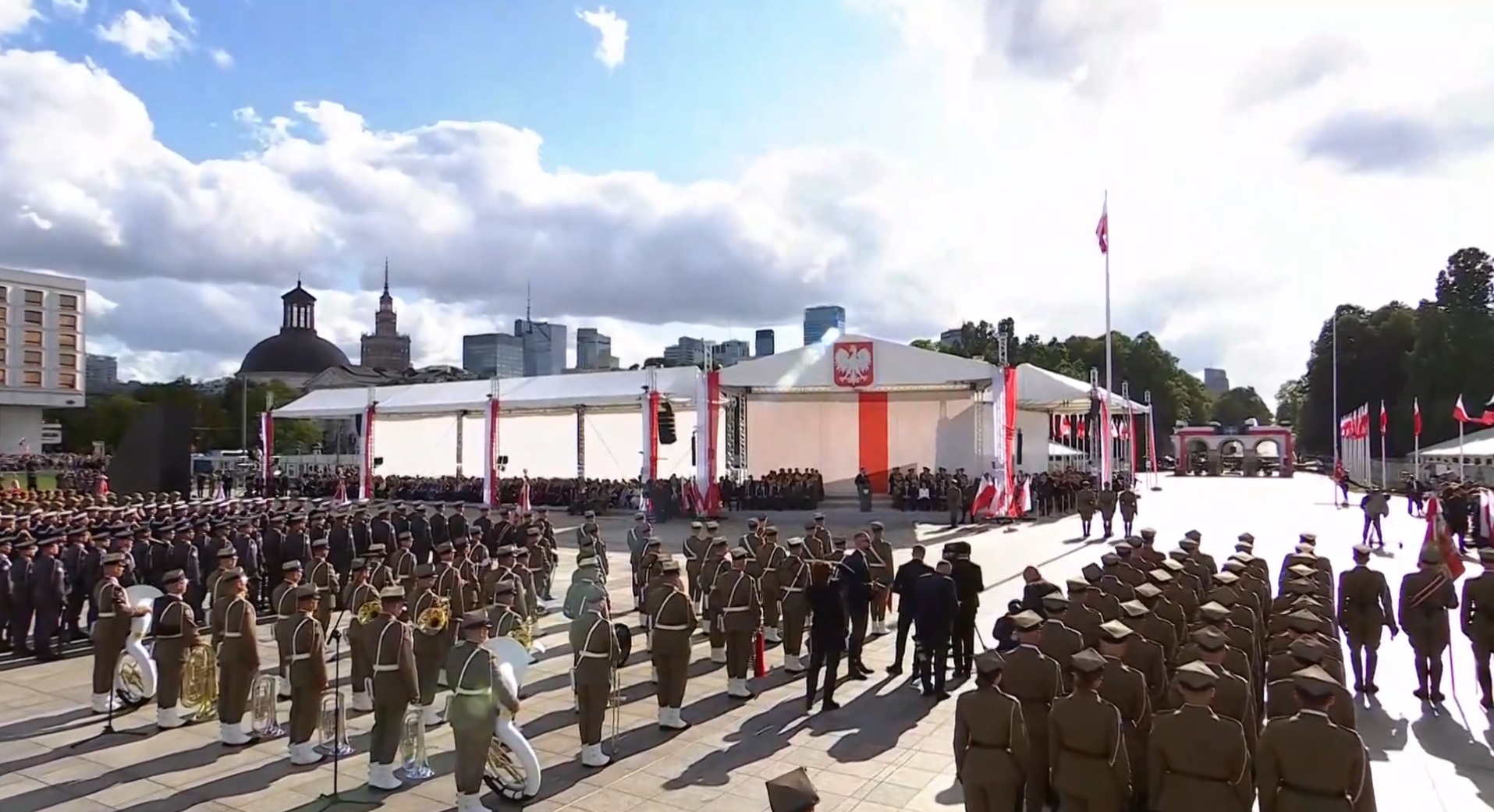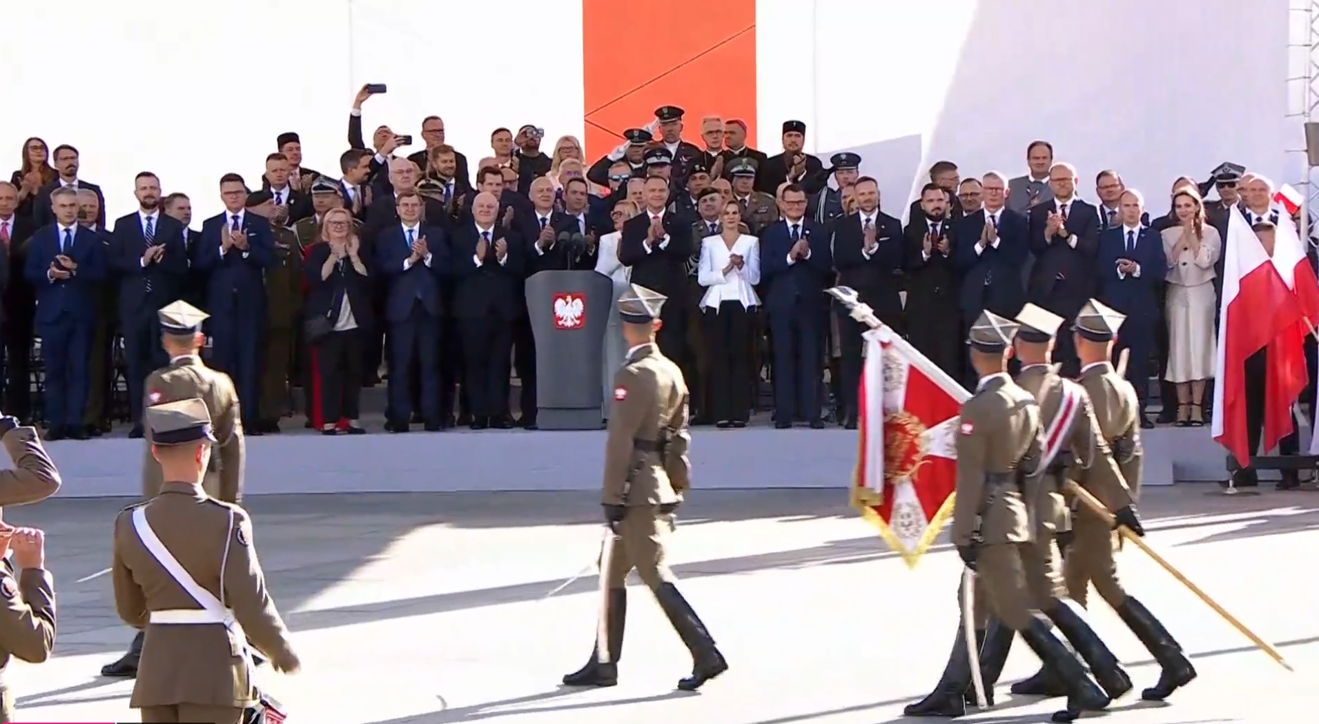 Nowy prezydent zwrócił się do zgromadzonych słowami: „Czołem Bohaterowie! (…) Przez całe 5 lat sprawowania mojego urzędu będą Was - żołnierze - nazywać bohaterami naszej współczesności. Bo nimi jesteście! Jesteście świadomi tego, że w zakresie Waszych obowiązków wpisane jest poświęcenie, i to, by o Ojczyznę się bić. – powiedział Zwierzchnik Sił Zbrojnych. Dziś jedynym naszym symbolem i znakiem jest Orzeł Biały i biało-czerwona flaga, a Wasz Prezydent nigdy - obiecuję - nie powie do Was „naprzód!”. Zawsze będę mówił „za mną!” – kończąc, zaapelował do zgromadzonych prezydent Karol Nawrocki.