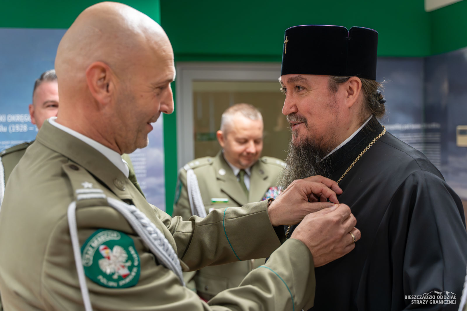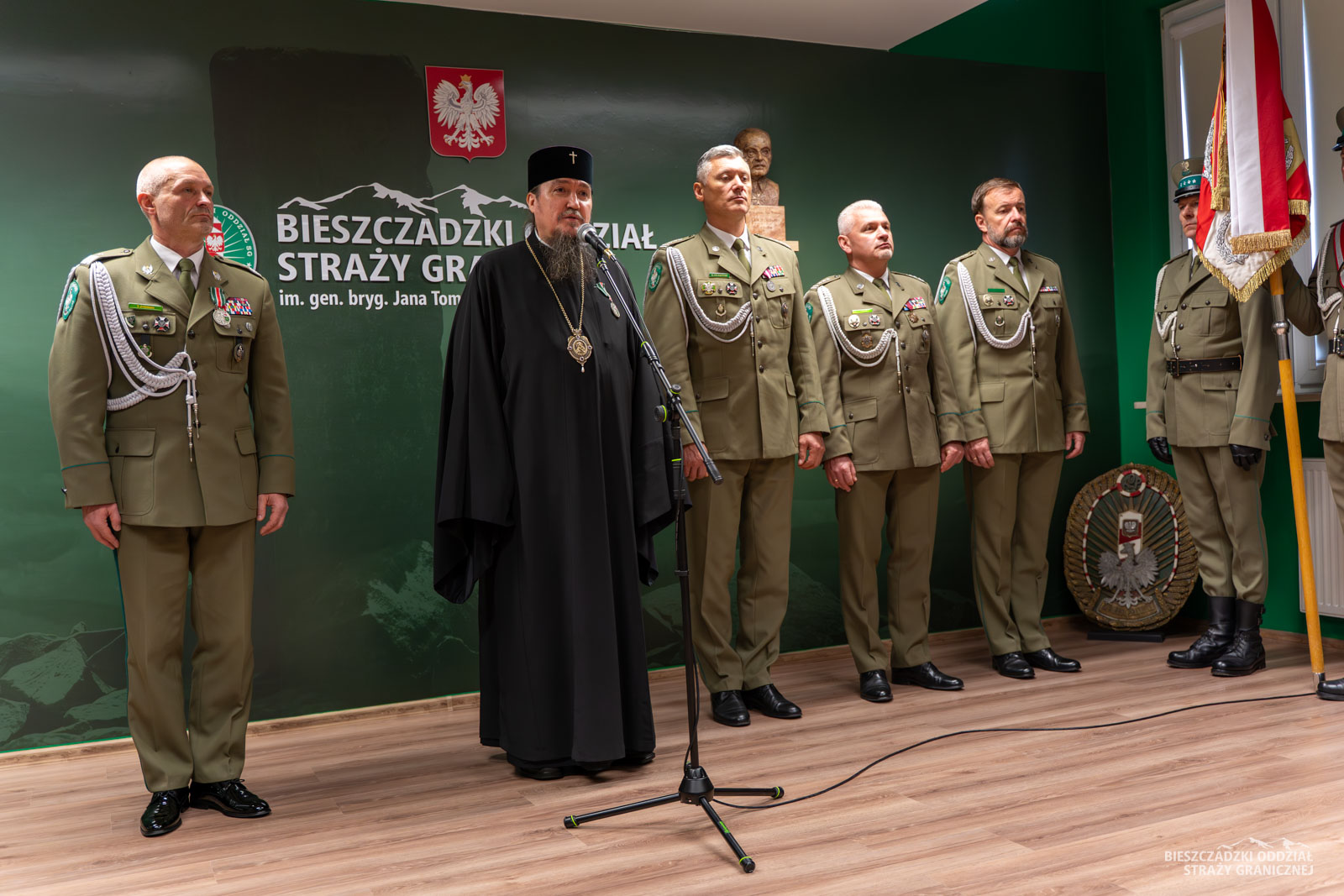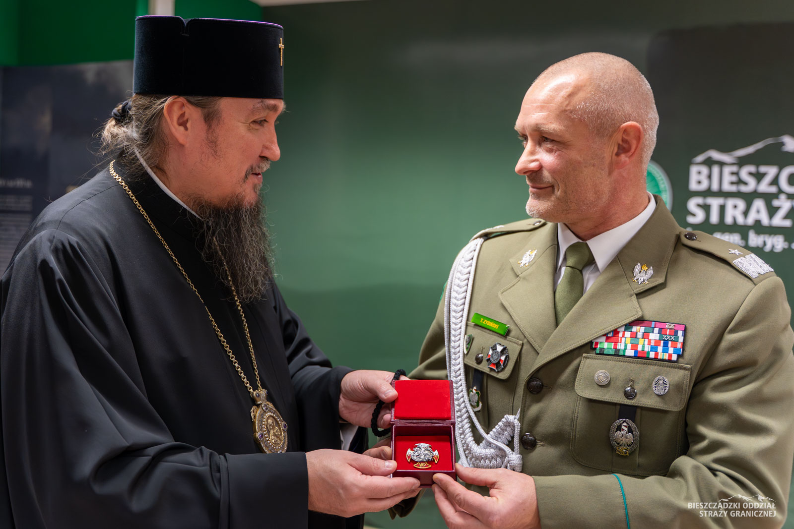 Po wprowadzeniu sztandaru i odśpiewaniu Hymnu Państwowego – Mazurka Dąbrowskiego głos zabrał komendant BiOSG gen. bryg. SG Tomasz Zybiński. W słowach powitania zwrócono uwagę na otwartość straży granicznej względem Prawosławnego Ordynariatu Wojska Polskiego oraz potrzebę szerokiego duchowego wsparcia wobec funkcjonariuszy i pracowników SG. Obecność Ekscelencji na terenie Bieszczadzkiego Oddziału Straży Granicznej nobilituje nas do pielęgnowania duchowego etosu wśród naszych podwładnych, a także do współpracy z kapelanami w dobie szczególnych wyzwań na wschodniej granicy Ojczyzny – podkreślił Komendant. W uznaniu zasług i zaangażowania w budowie dialogu, propagowania wartości duchowych oraz wzmacniania wzajemnych więzi, Kapituła Odznaki Pamiątkowej Bieszczadzkiego Oddziału Straży Granicznej, mocą uchwały nr 81/2025 z dnia 28 października br., postanowiła uhonorować Prawosławnego Ordynariusza Wojskowego abp. Jerzego wyjątkowym wyróżnieniem Galerią Odznak Pamiątkowych BiOSG. Galerię odznak wręczył gen. bryg. SG Tomasz Zybiński.