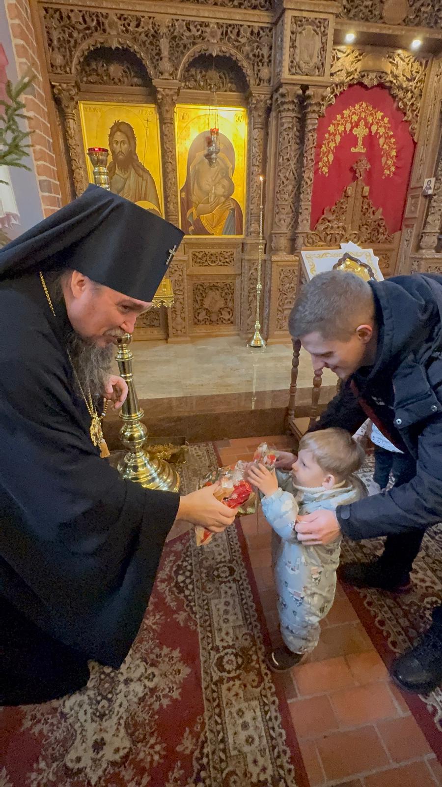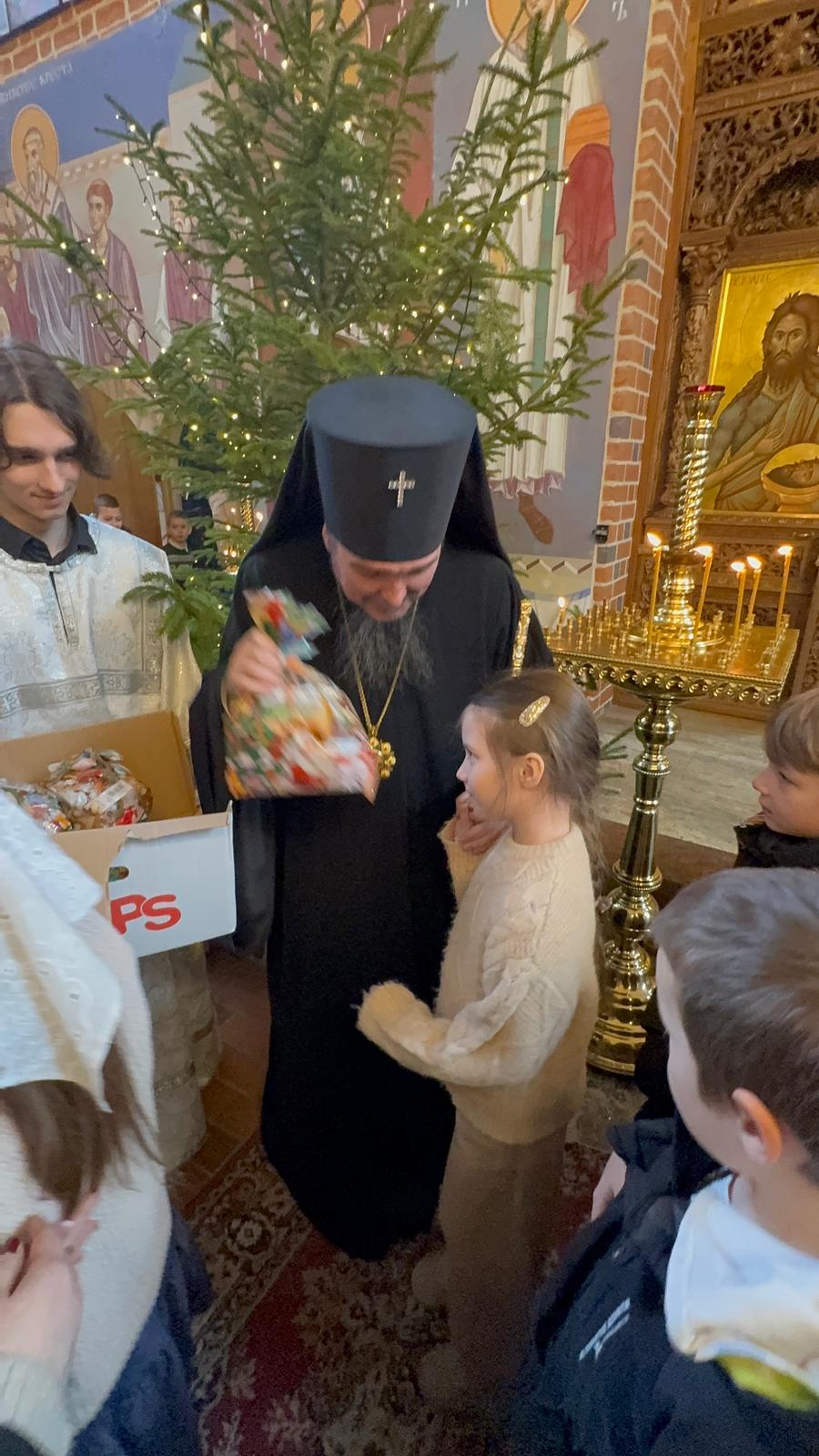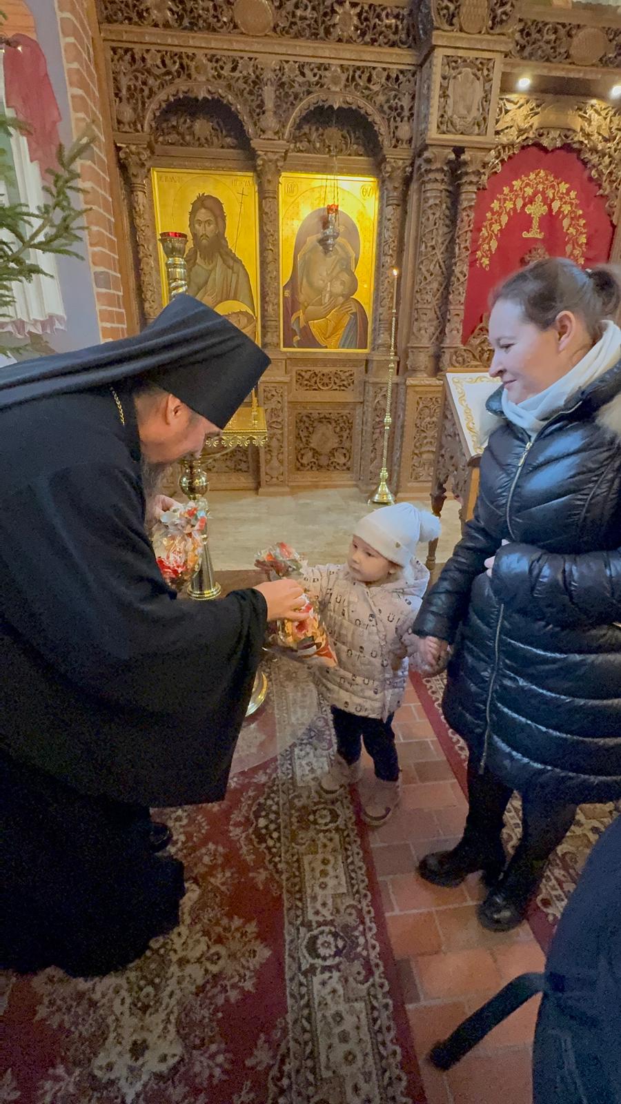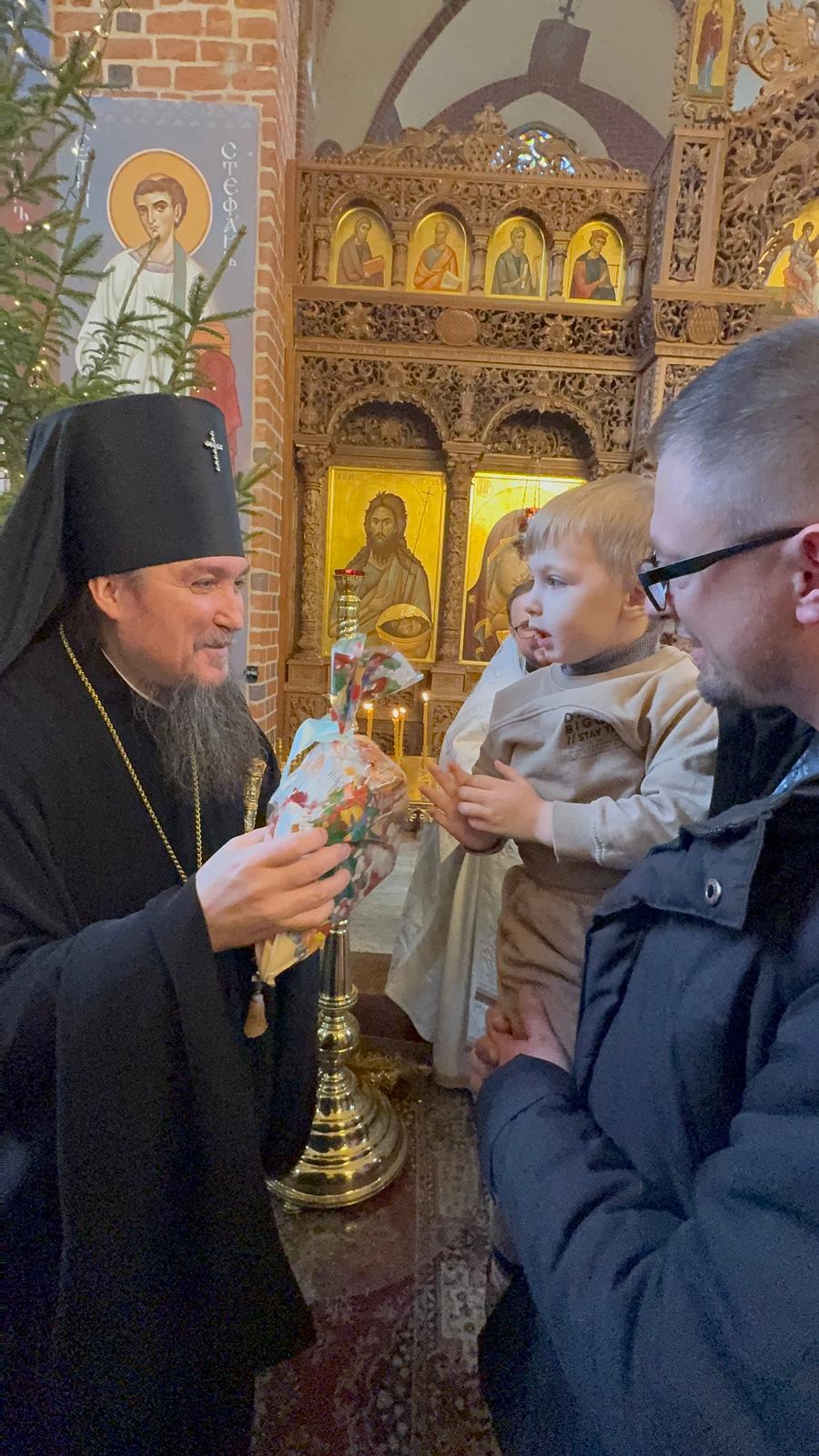 Po zakończeniu Boskiej Liturgii Władyka Jerzy pozdrowił wszystkich obchodzących dziś imieniny - Dawidów, Józefów i Jakubów, w tym w sposób szczególny dyrygenta katedralnego chóru - lektora Dawida Dubeca. Następnie abp Jerzy rozdawał licznie zgromadzonym w świątyni dzieciom świąteczne prezenty. Ponad setka najmłodszych otrzymała od Władyki upominki przedłużając tym samym dziecięcą radość z okazji świąt Bożego Narodzenia.