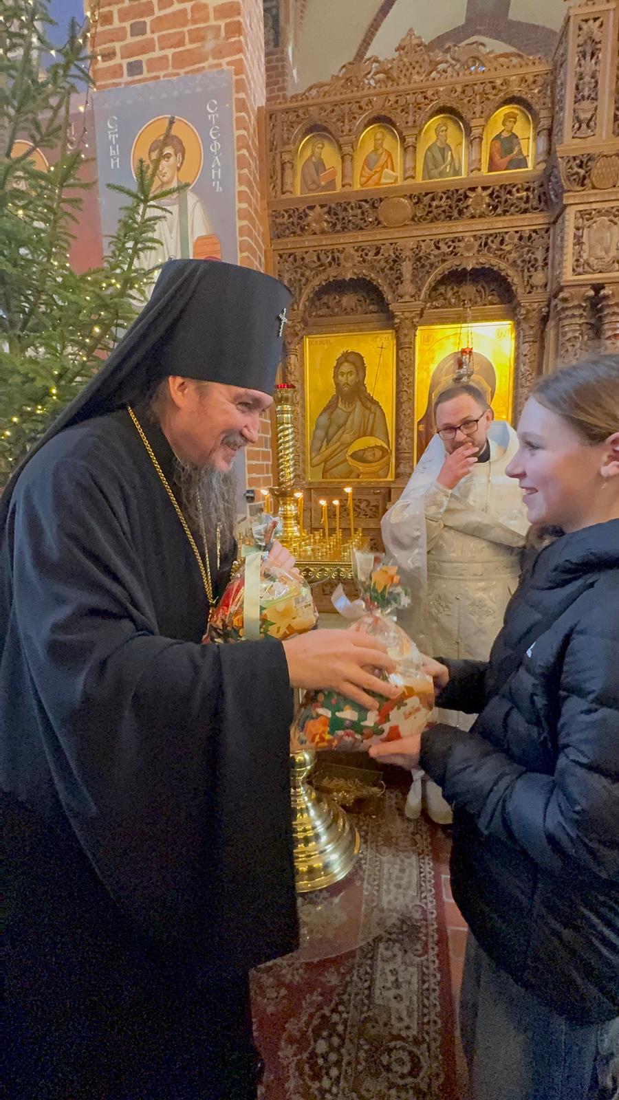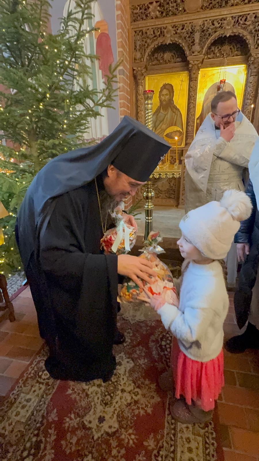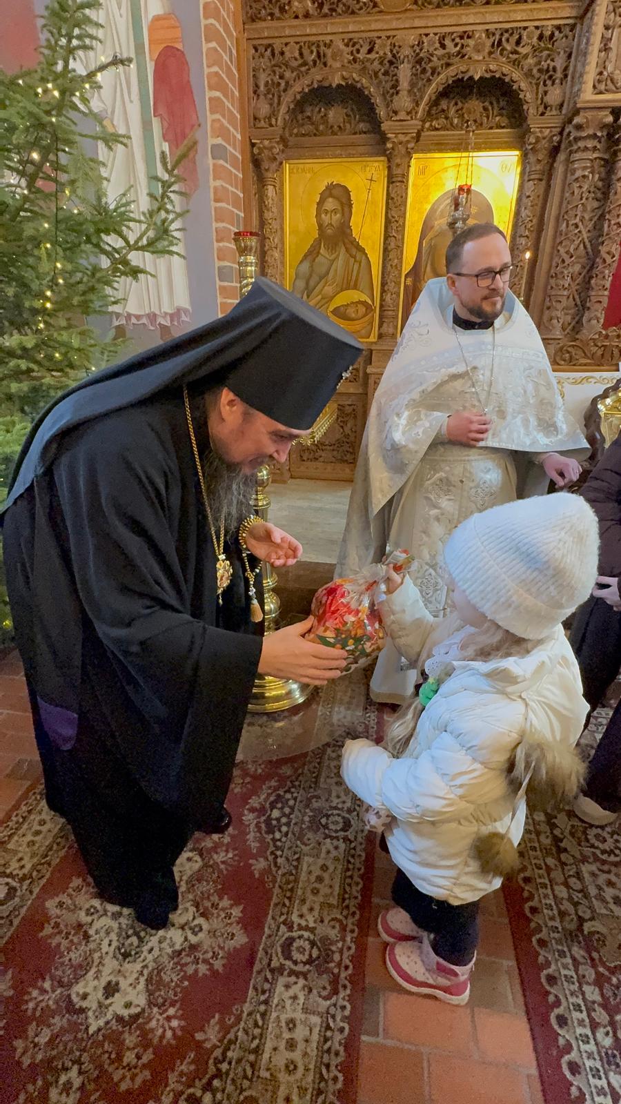 Po zakończeniu Boskiej Liturgii Władyka Jerzy pozdrowił wszystkich obchodzących dziś imieniny - Dawidów, Józefów i Jakubów, w tym w sposób szczególny dyrygenta katedralnego chóru - lektora Dawida Dubeca. Następnie abp Jerzy rozdawał licznie zgromadzonym w świątyni dzieciom świąteczne prezenty. Ponad setka najmłodszych otrzymała od Władyki upominki przedłużając tym samym dziecięcą radość z okazji świąt Bożego Narodzenia.