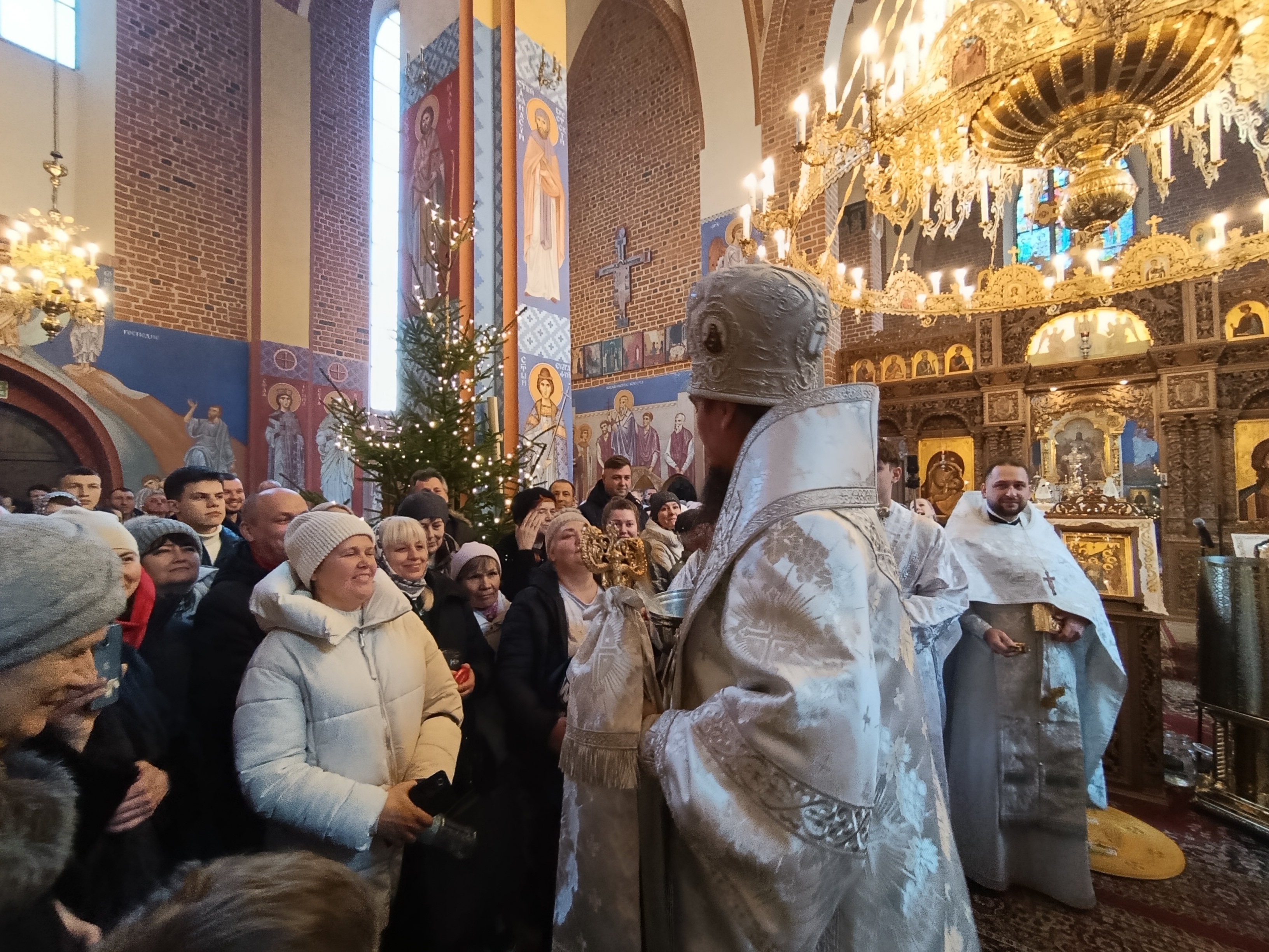 Po zakończeniu Świętej Liturgii miał miejsce obrzęd Wielkiego Oświęcenia Wody. W trakcie Oświęcenia czytane są teksty starotestamentowych proroctw, specjalne modlitwy oraz ektenie, w których wyrażana jest prośba o to, aby Bóg w swojej niezmierzonej miłości do człowieka zesłał z niebios Łaskę Świętego Ducha. Oświęcona w ten sposób woda staje się Wielką Hagiasmą, specjalną wodą oświęcaną tylko i wyłącznie z okazji święta Chrztu Pańskiego. Po zakończeniu nabożeństw Władyka Jerzy jeszcze raz zwrócił się z pozdrowieniem do wiernych dziękując im za wspólną modlitwę. Następnie w związku z przypadającym wkrótce dniem niebiańskiego patrona Władyki - św. Jerzego Chozewity, ks. Adam Góralczuk w imieniu wiernych oraz duchowieństwa złożył Jego Ekscelencji imieninowe życzenia. Dziękując za arcypasterską służbę, modlitwę oraz duchową opiekę wręczył Władyce bukiet kwiatów a chór oraz wszyscy zgromadzeni zaśpiewali gromkie “Mnohaja leta”.