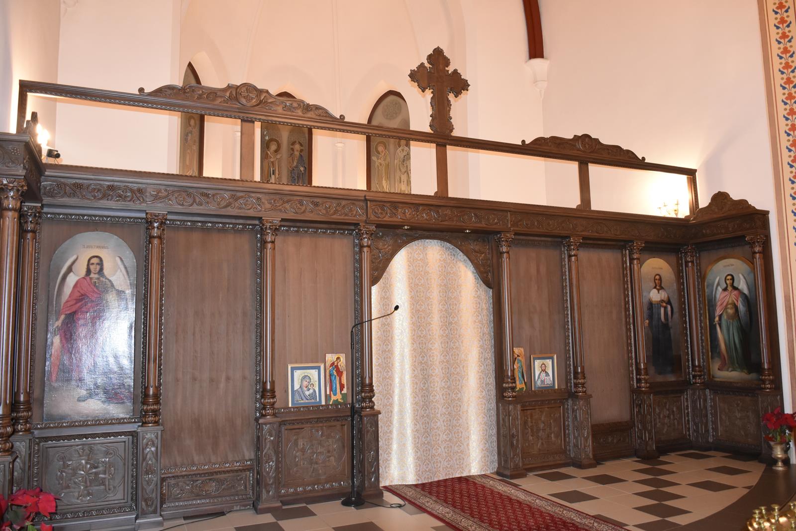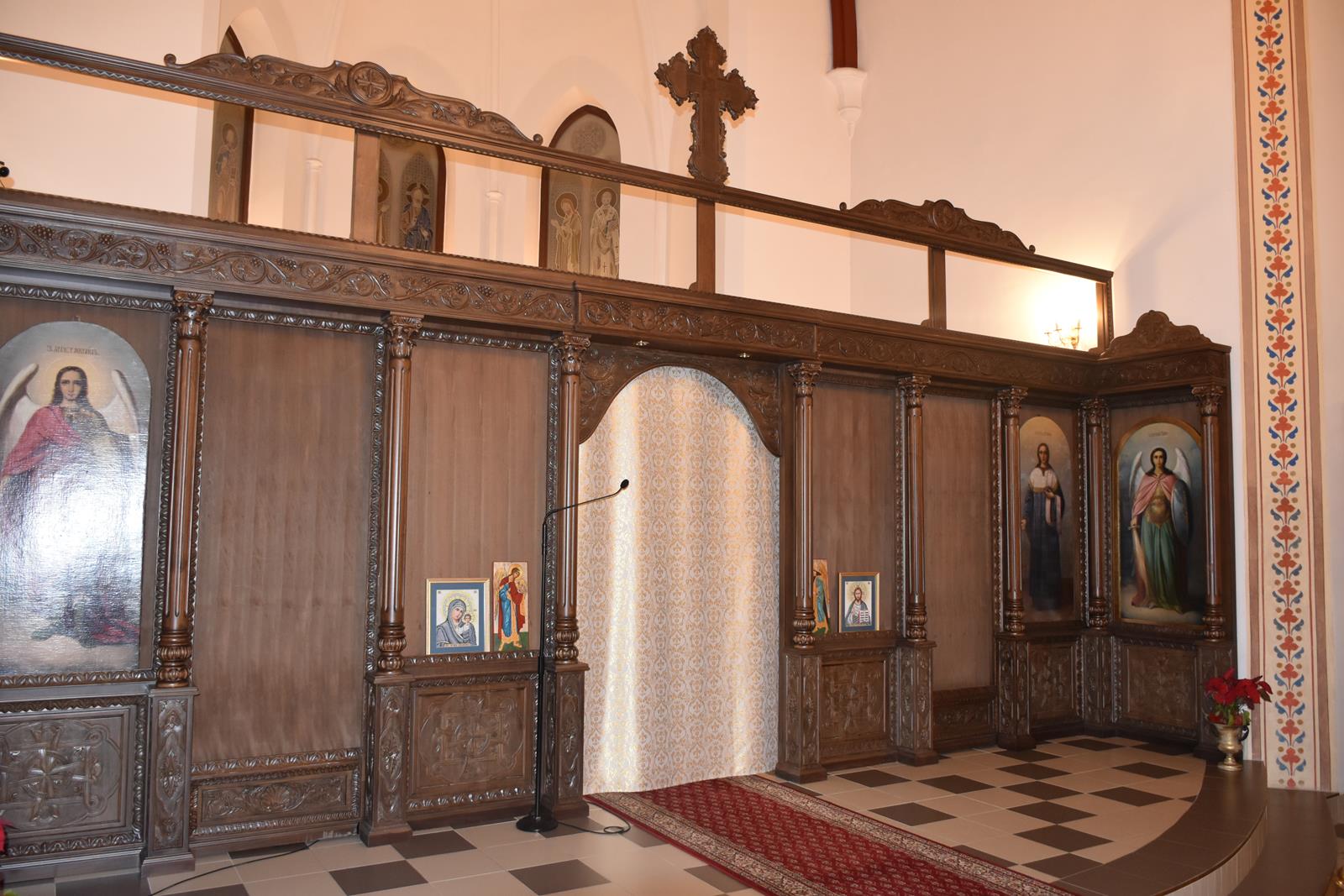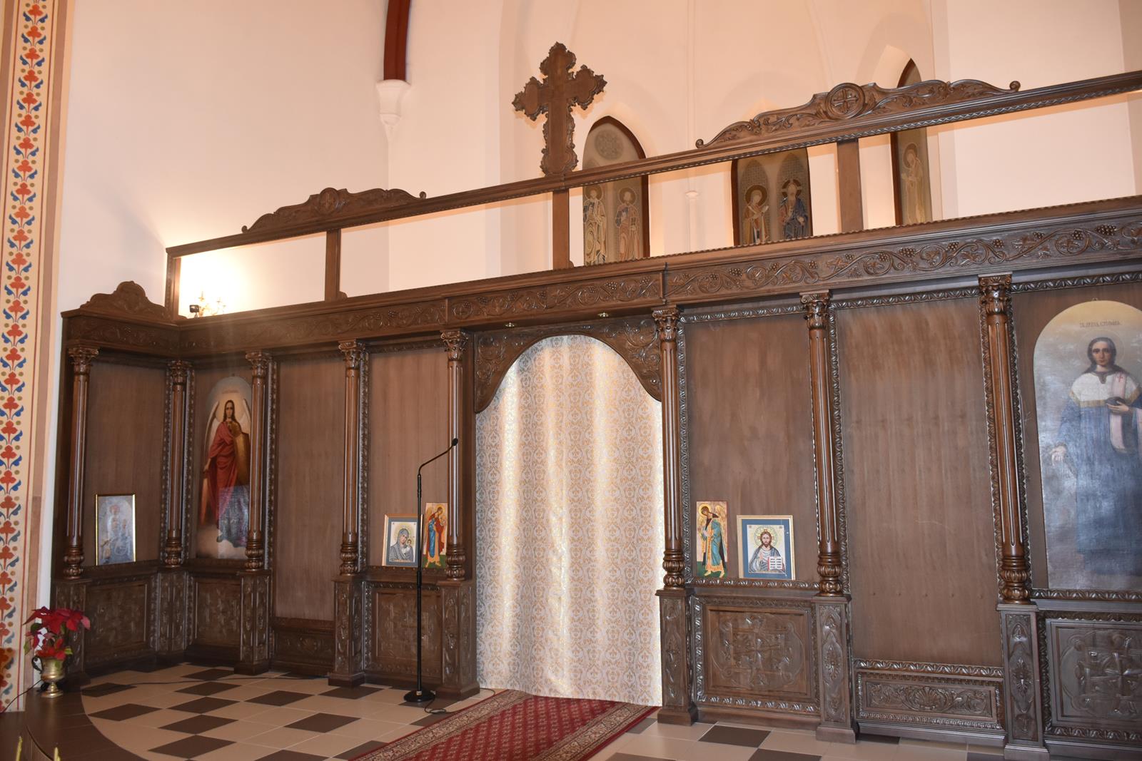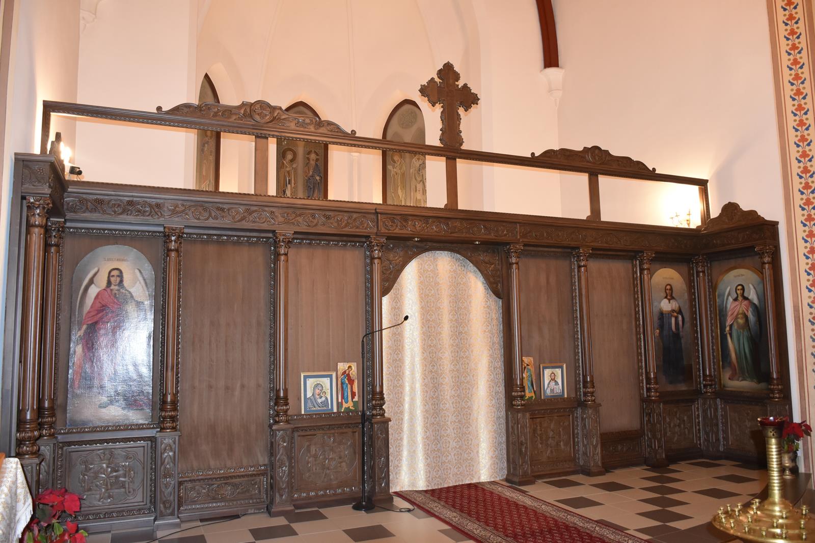 -6 Ikon głównych o wymiarach: 71 x 1,43 cm ( Ikona Jezusa Chrystusa, Bogurodzicy, Św. Mikołaja Cudotwórcy, Św. Ap. Piotra, Św. Ap. Pawła , Św. Wielkomęczennika i Cudotwórcy Pantelejmona,