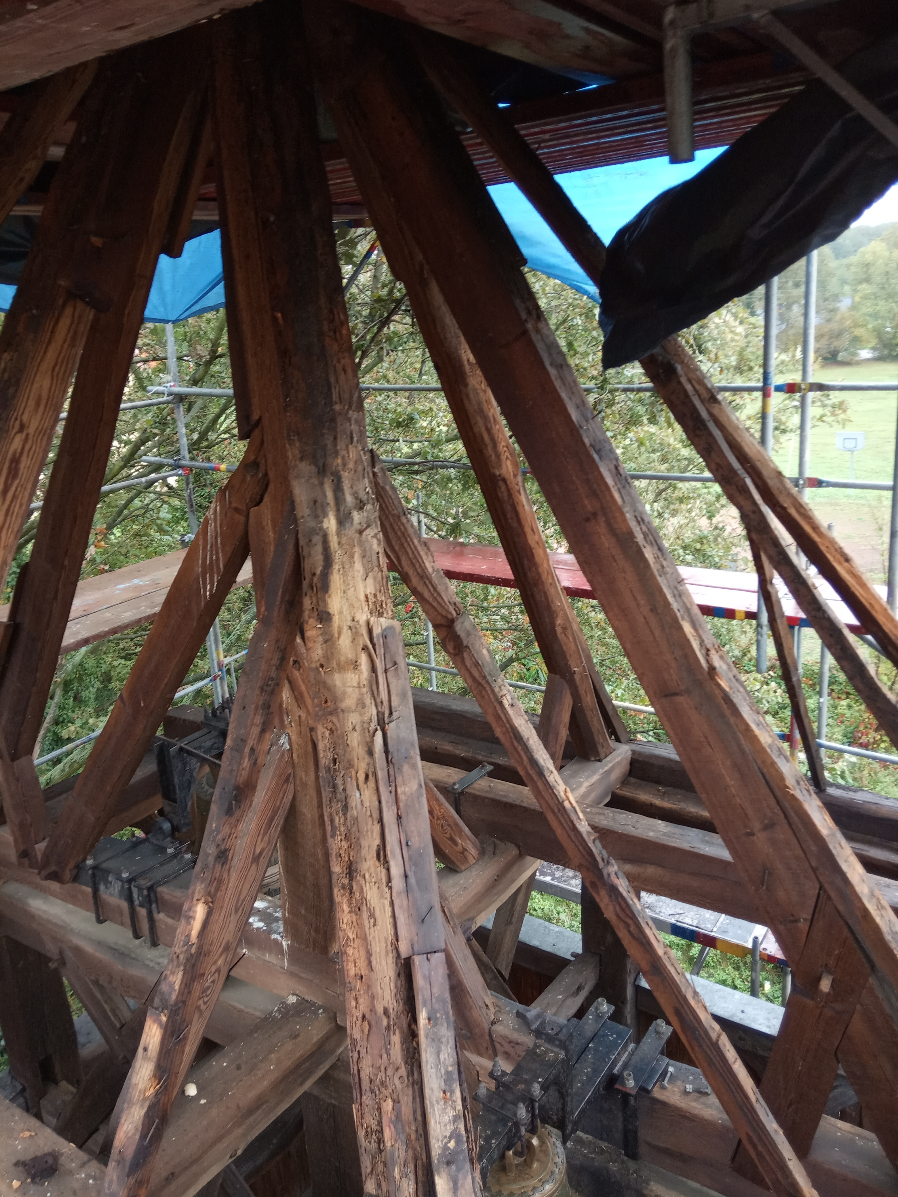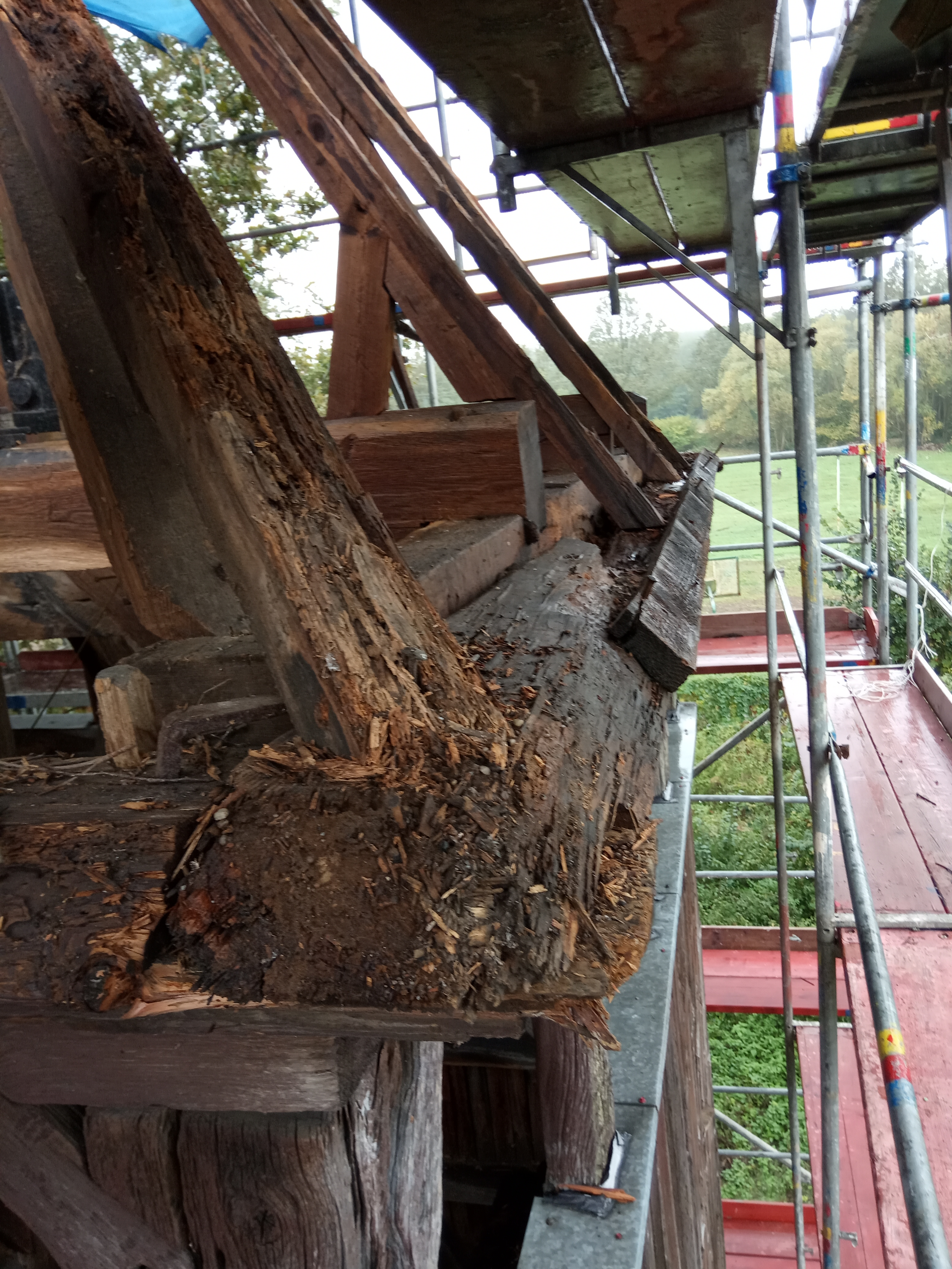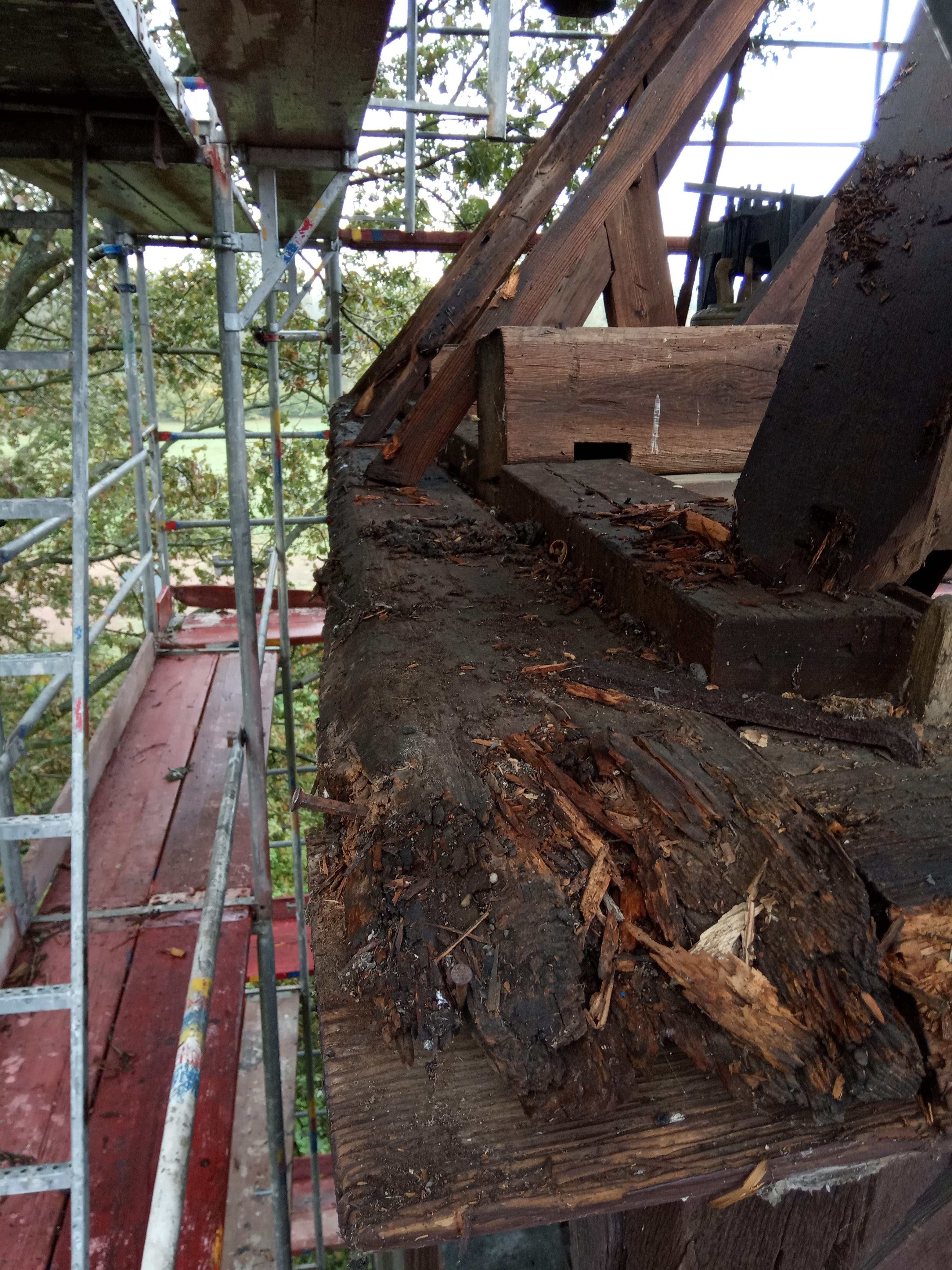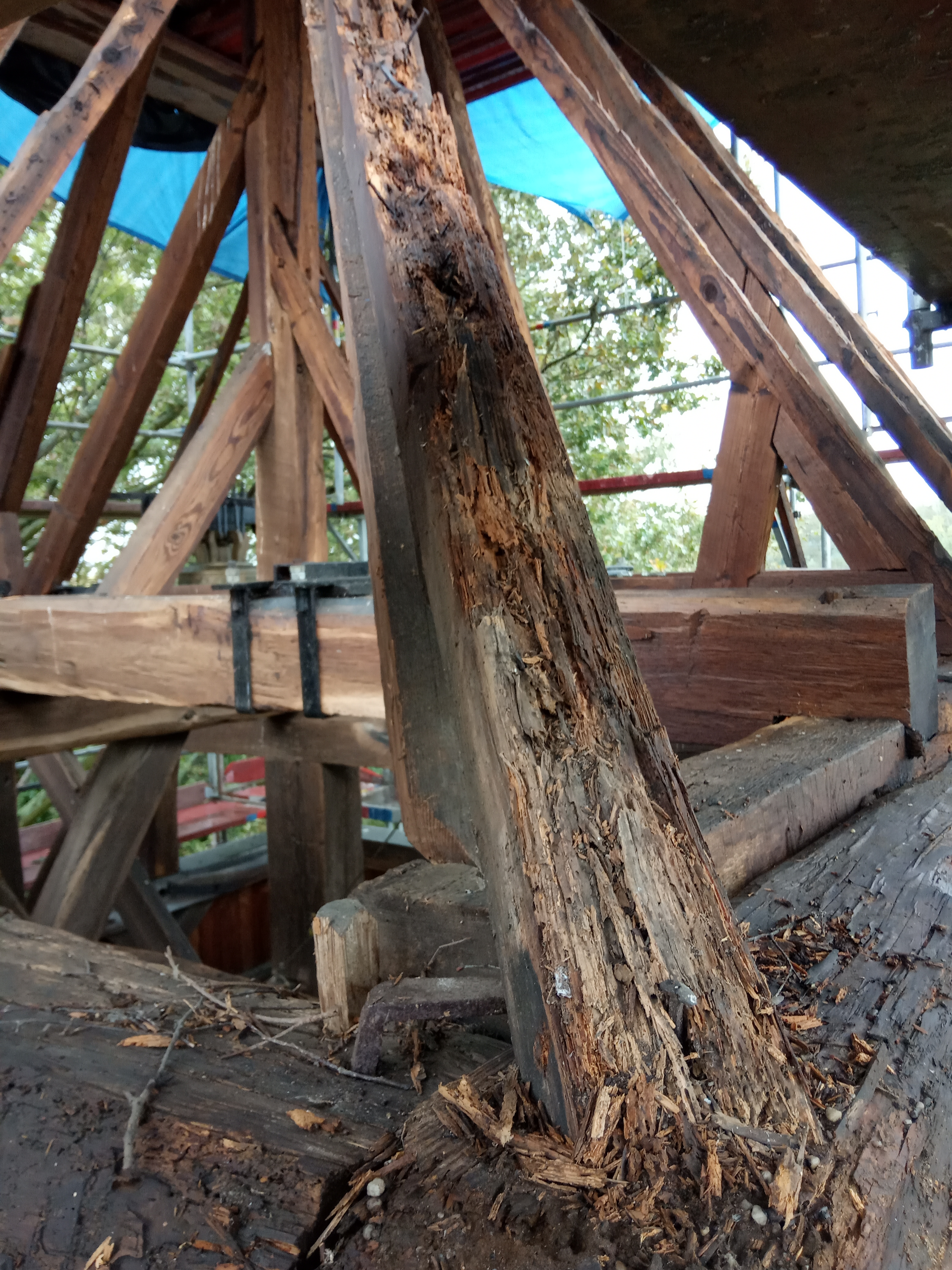 Całkowicie wymieniona została więźba dachowa, chociaż początkowo planowano, że wymienić należy jedynie około 20% . Niestety, kiedy rozpoczęto rozbiórkę pokrycia dachowego, okazało się, że żadna belka nie nadaje się do dalszej eksploatacji. Dlatego decyzja była tylko jedna – wymienić należy wszystko. Te elementy, które na pozór wyglądają na dobre, przy dokładniejszym obejrzeniu okazało się, że czas i kornik zrobili swoje.