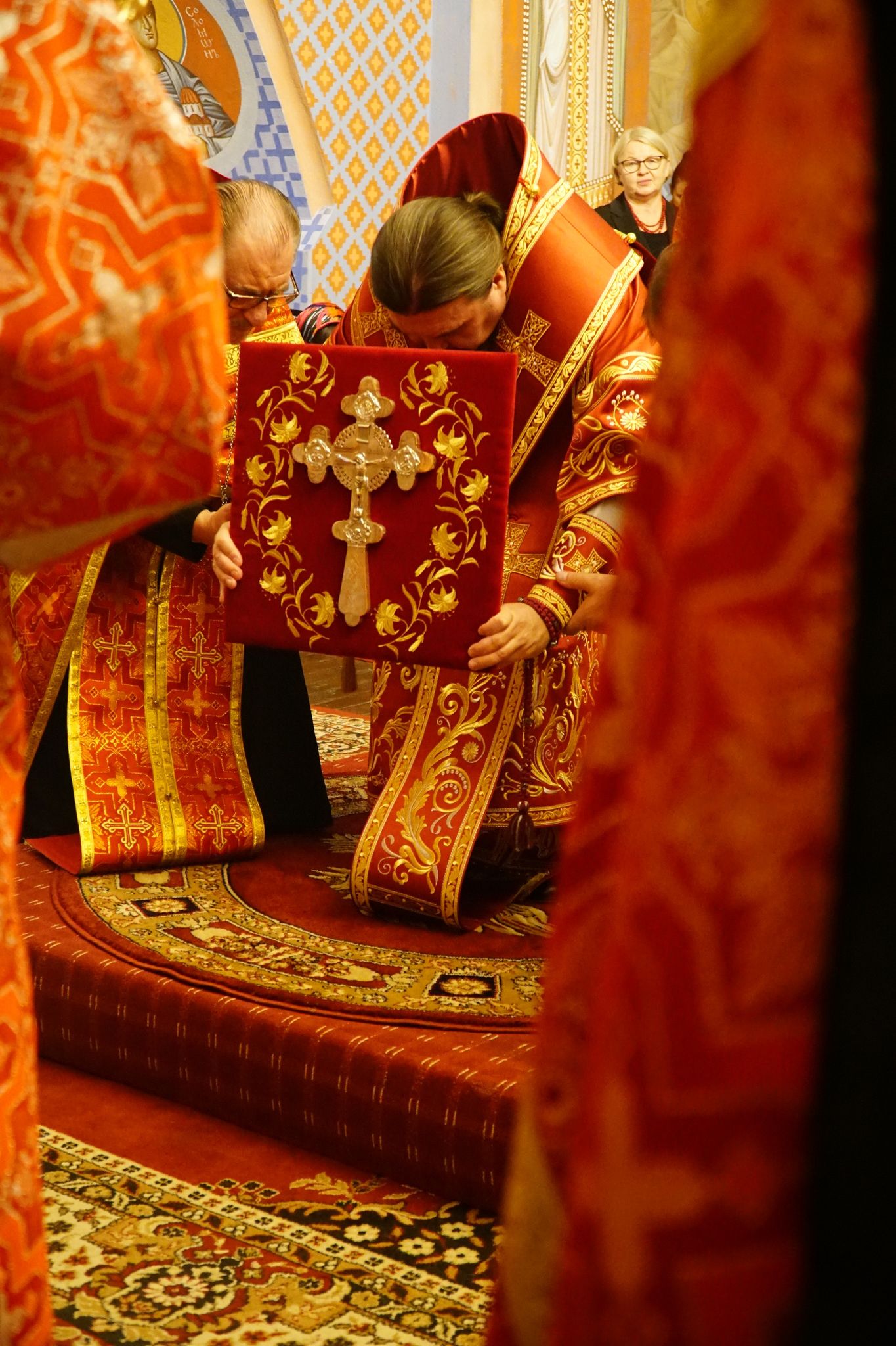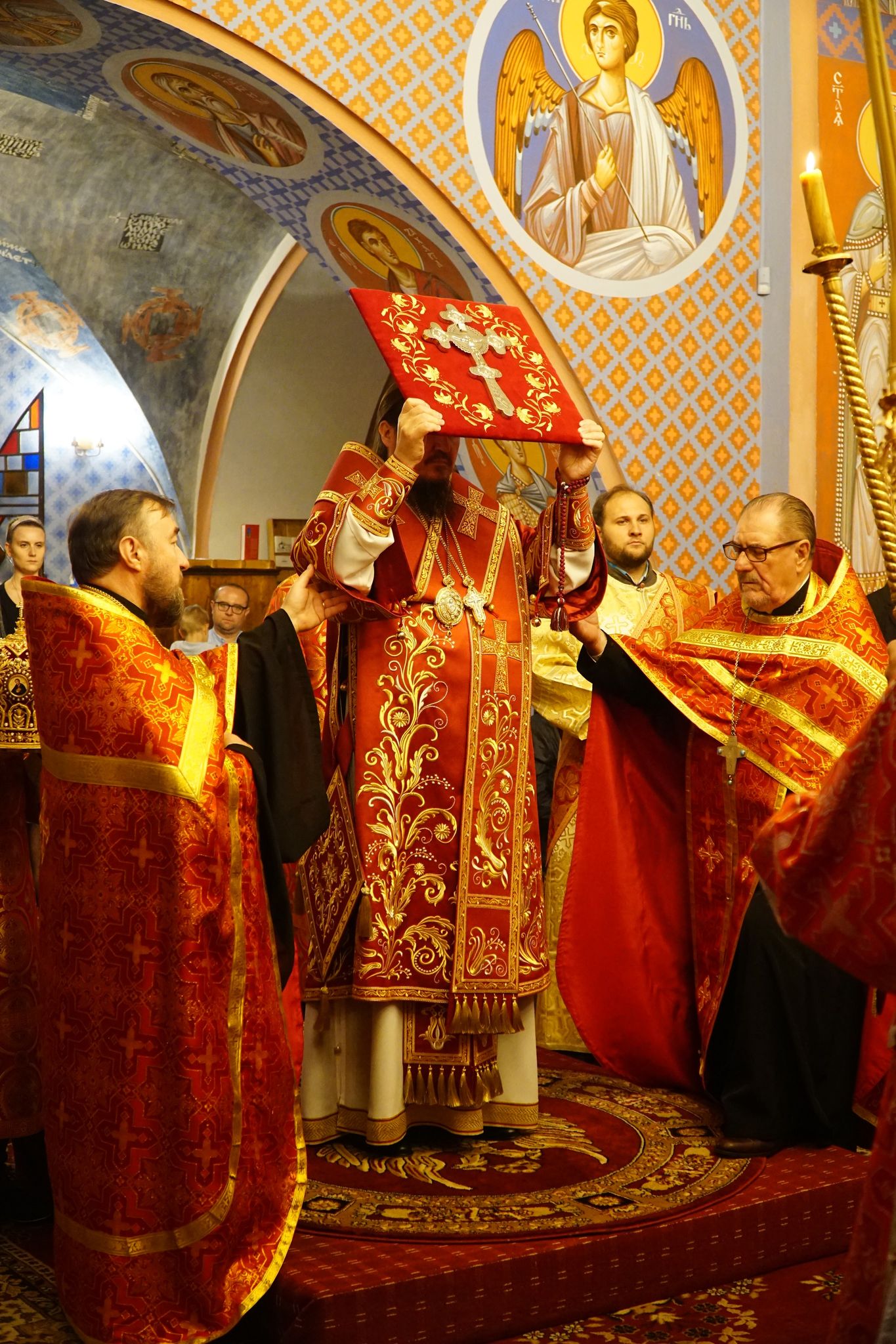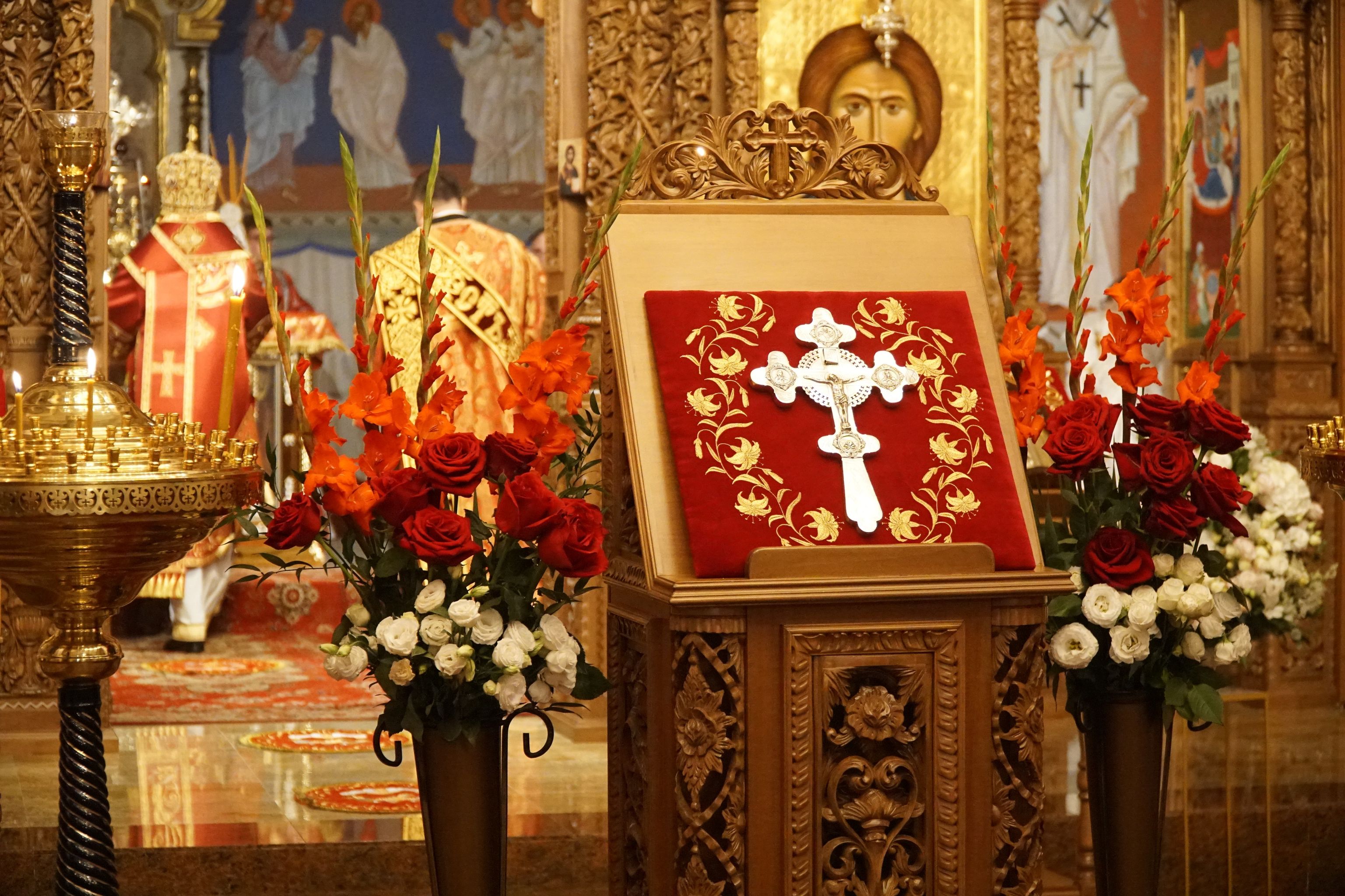 Tego dnia w katedrach biskupich dokonywany jest specjalny obrzęd Podwyższenia Krzyża, sprawowany przez arcypasterza. Podczas Wielkiej Doksologii, przewodniczący nabożeństwu biskup w towarzystwie diakona dokonuje trzykrotnego okadzenia ołtarza, na którym leży Święty Krzyż. Następnie, po trzech pokłonach, klęcząc, biskup podnosi Krzyż umieszczając go nad głową. Chór w tym czasie wykonuje pieśń “Święty Boże”. Niosącego Krzyż biskupa poprzedza okadzający świętość diakon oraz prysłużnicy z zapalonymi świecami.