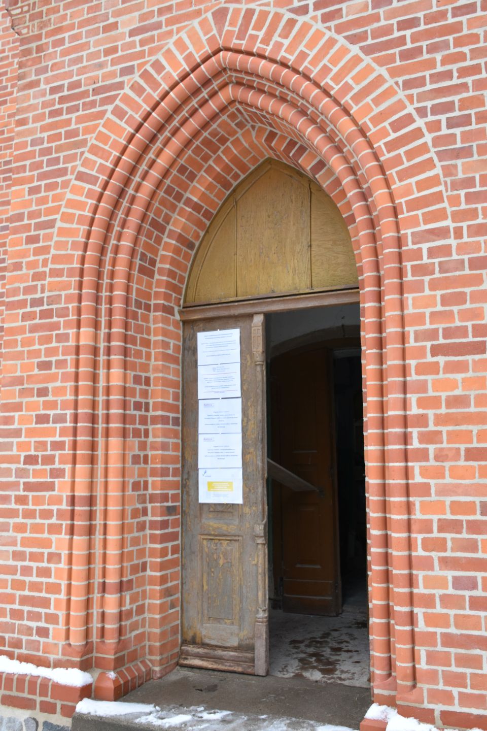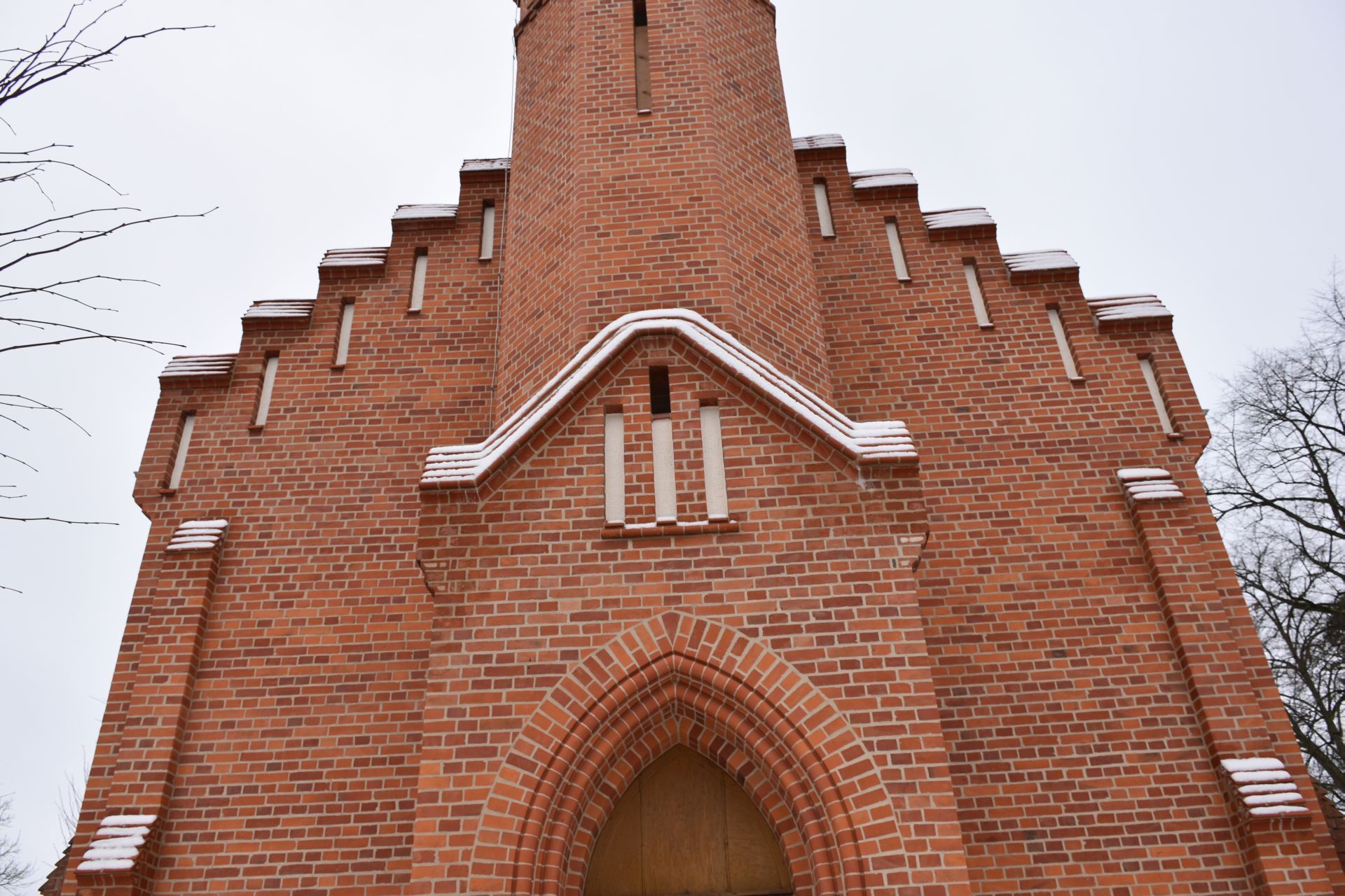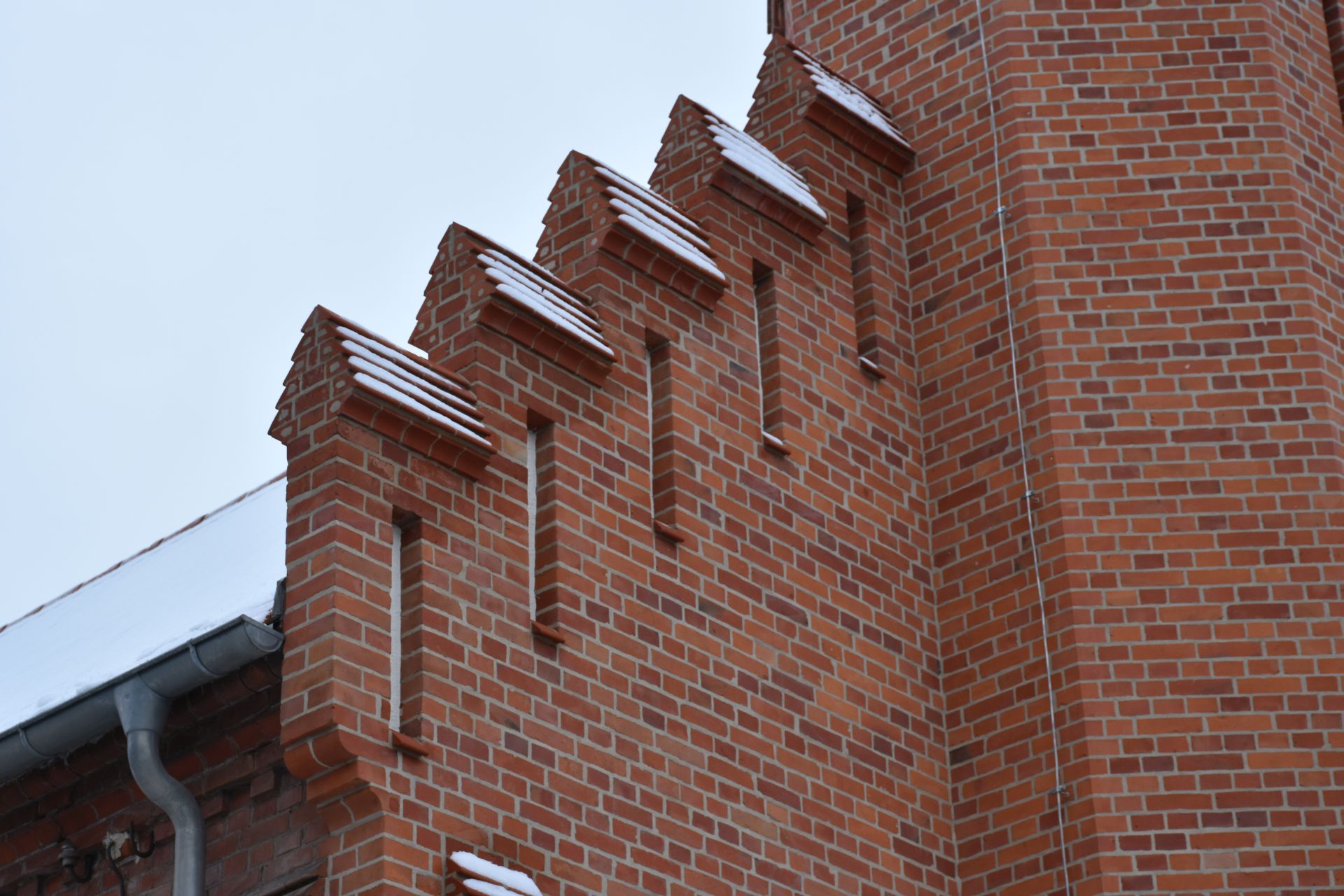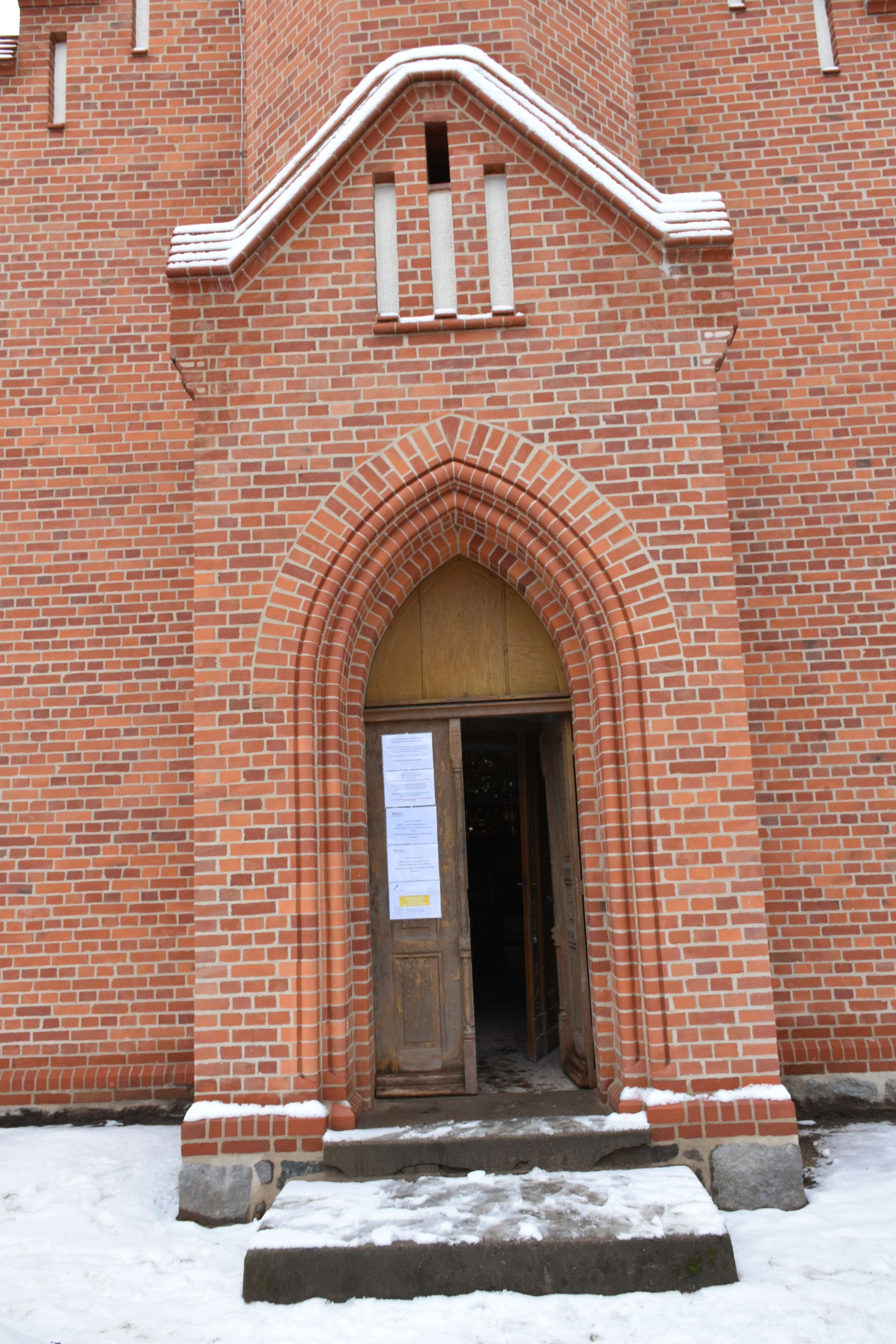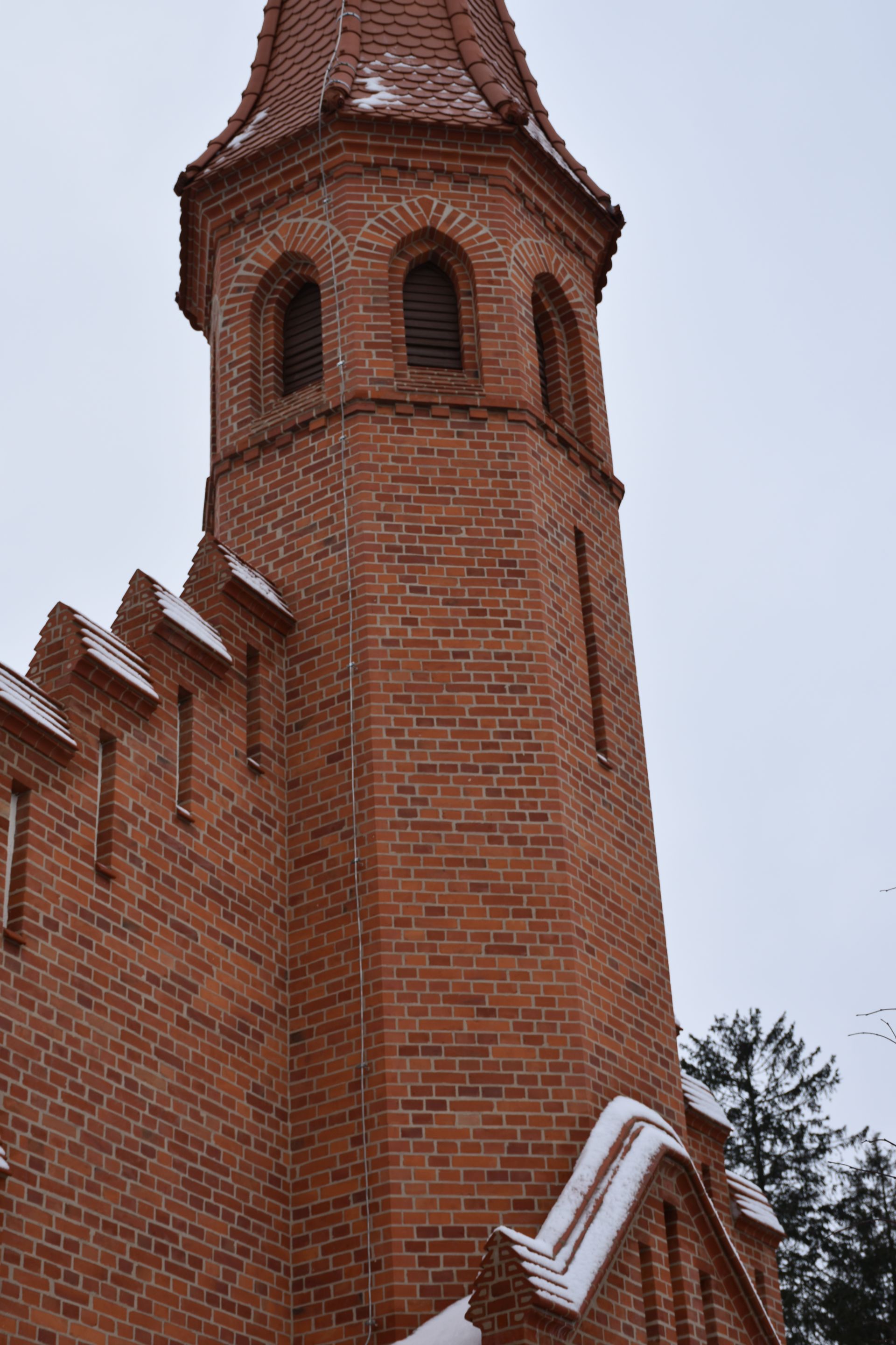 Prace zewnętrze: remont elewacji wieży z zszyciem murów, spoinowanie, czyszczenie i wymianą uszkodzonych cegieł oraz kształtek wraz z okiennicami.