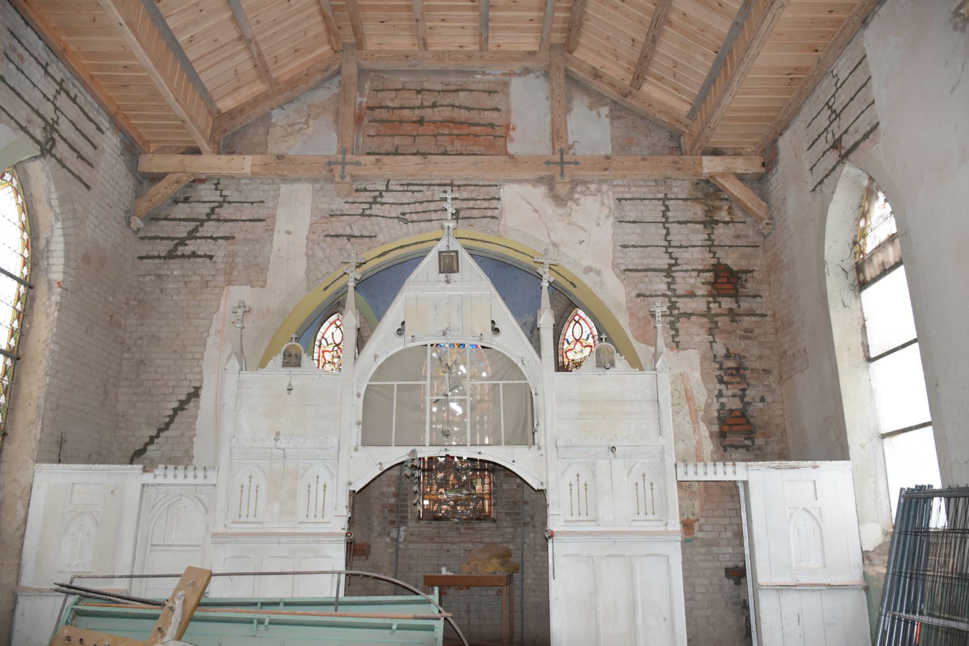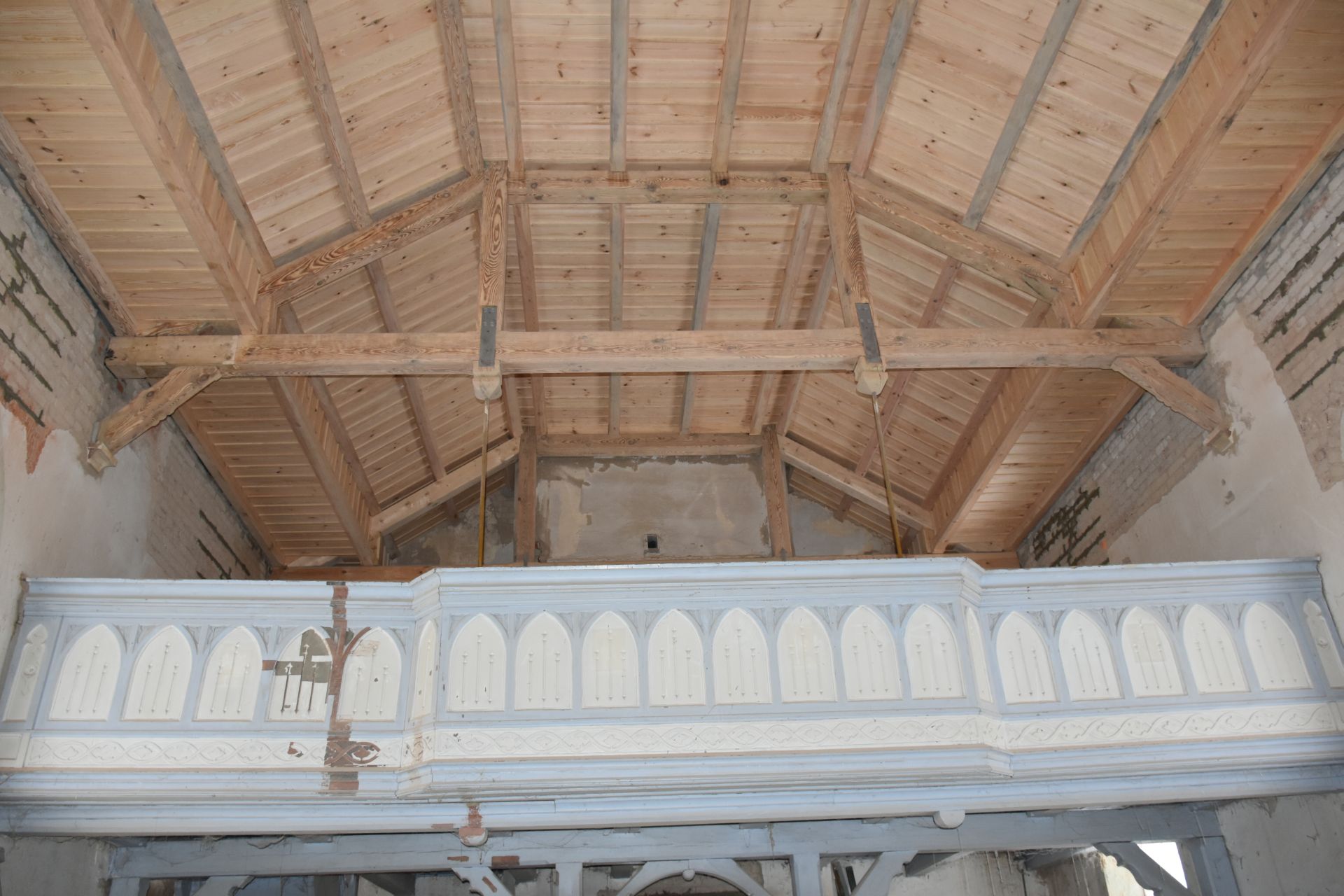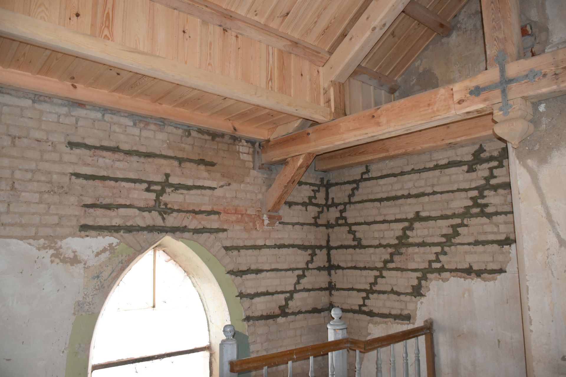 Prace wewnętrzne: remont uszkodzonych belek stropowych wraz ze stropem drewnianym, wymianę instalacji elektrycznej, skucie uszkodzonych tynków, zszycia murów, remont drabin i podestów na wieży.