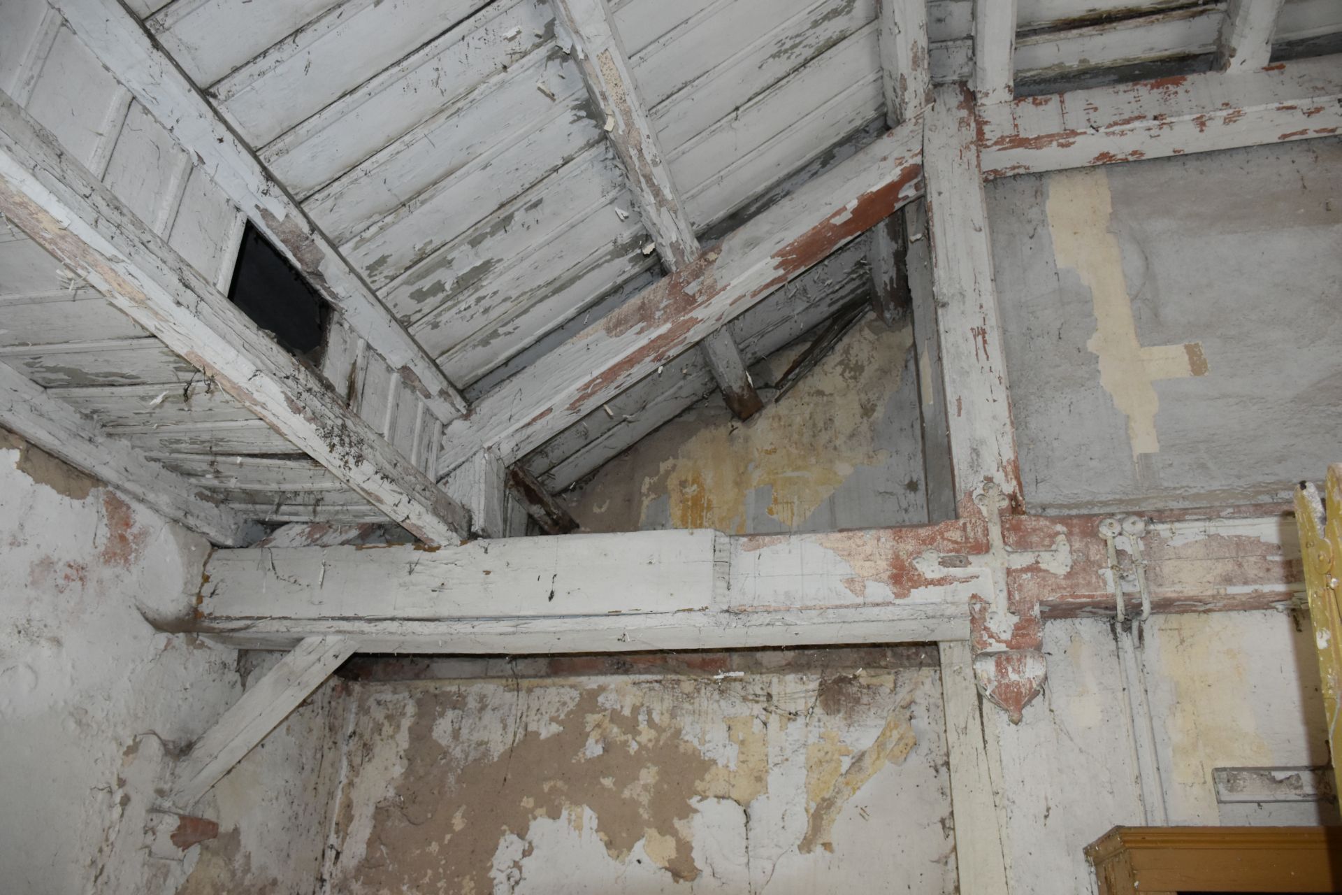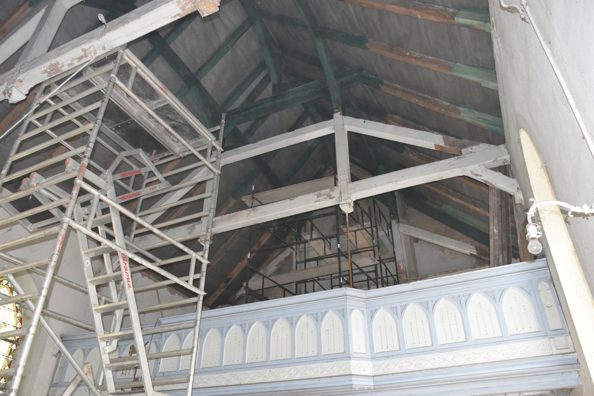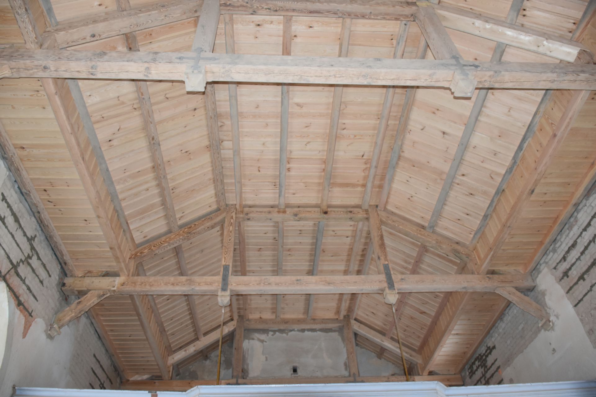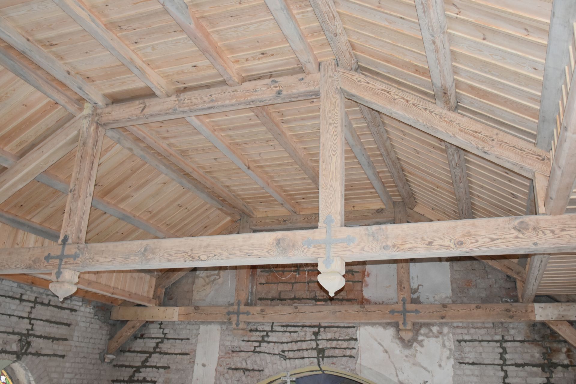 Prace wewnętrzne: remont uszkodzonych belek stropowych wraz ze stropem drewnianym, wymianę instalacji elektrycznej, skucie uszkodzonych tynków, zszycia murów, remont drabin i podestów na wieży.